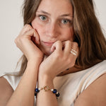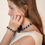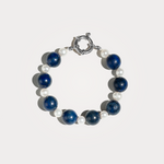 SIERRA, bracciale realizzato interamente a mano in acciaio chirurgico, disponibile sia nella versione in argento che nella versione placcata in oro 18k. È composto da perle di fiume naturali bianche e pietre di Lapislazzuli blu sferiche.