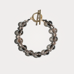 CALLAIA, bracciale realizzato interamente a mano in acciaio chirurgico, disponibile sia nella versione in argento che nella versione placcata in oro 18k. È composto da pietre naturali di Quarzo Fumè sferiche alternate in due diverse dimensioni, è inoltre possibile scegliere tra due chiusure diverse.