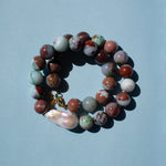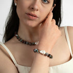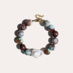 SIRENA, bracciale realizzato interamente a mano in acciaio chirurgico, disponibile sia nella versione in argento che nella versione placcata in oro 18k. È composto da pietre naturali di Diaspro multicolor sferiche e una perla di fiume naturale barocca.