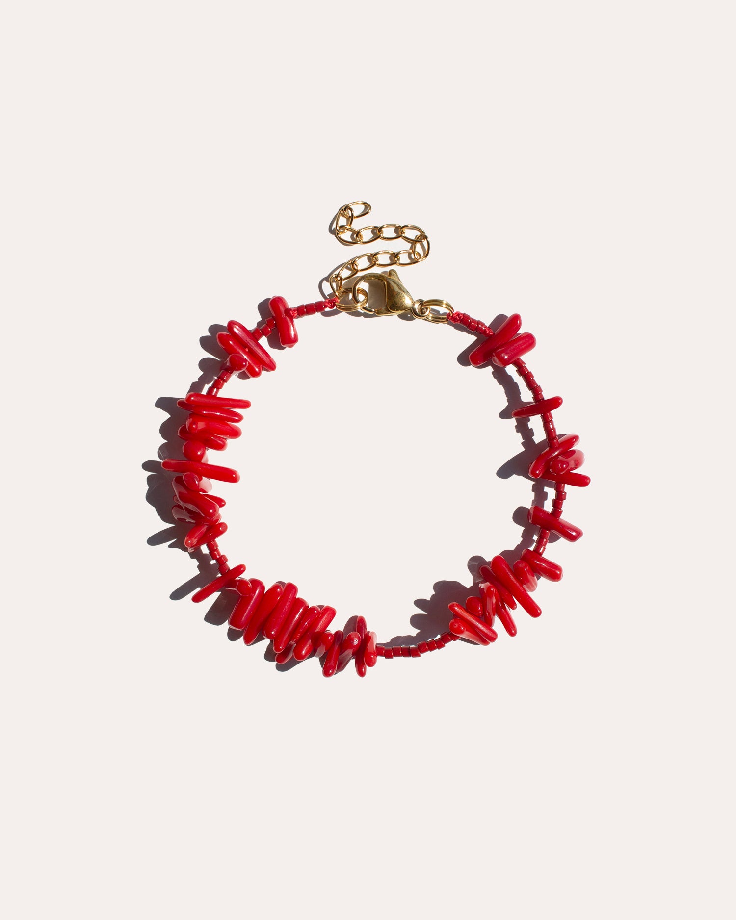 AITANA, bracciale realizzato interamente a mano in acciaio chirurgico, disponibile sia nella versione in argento che nella versione placcata in oro 18k. È composto da corallo di bambù naturale rosso e perline di vetro rosse.