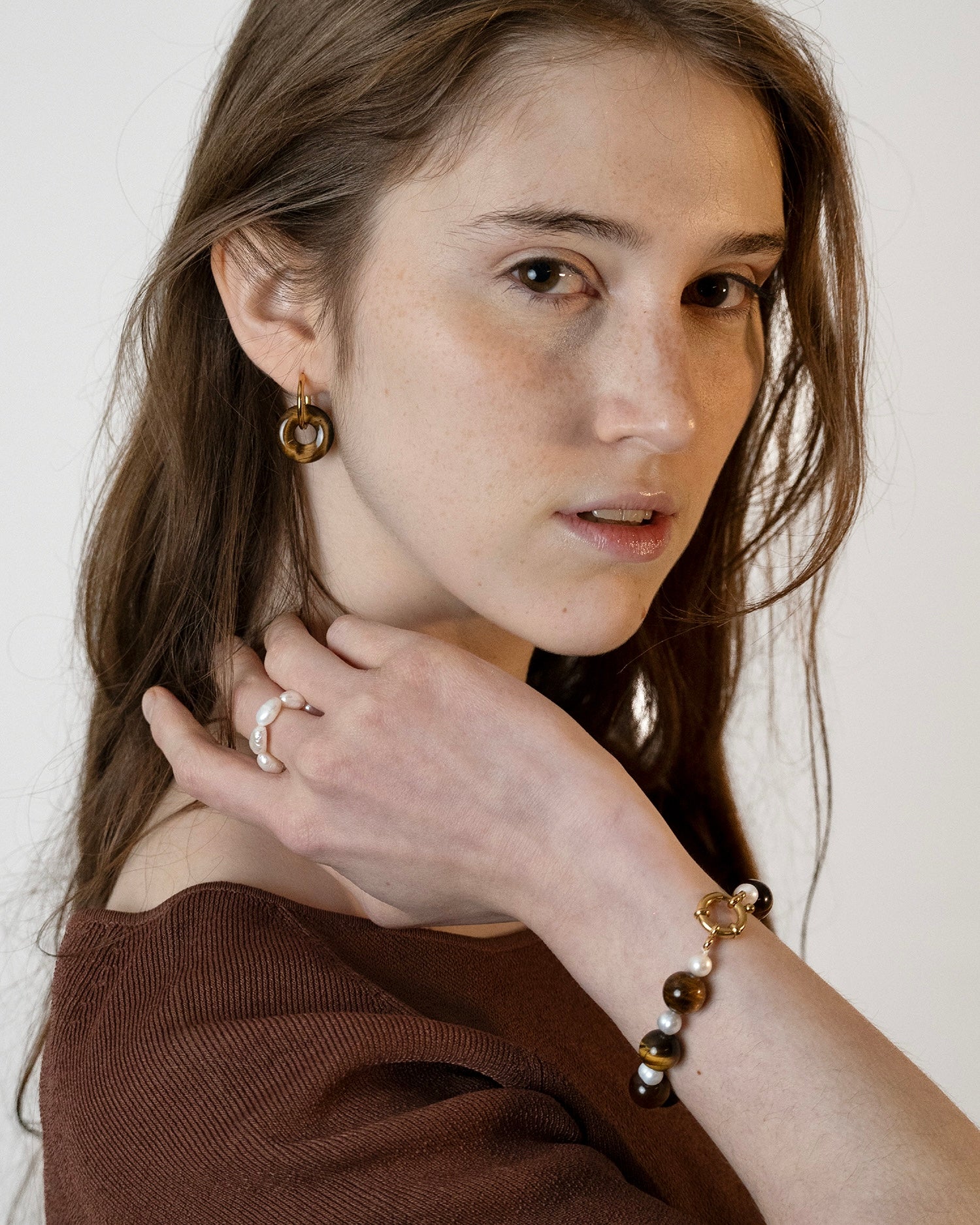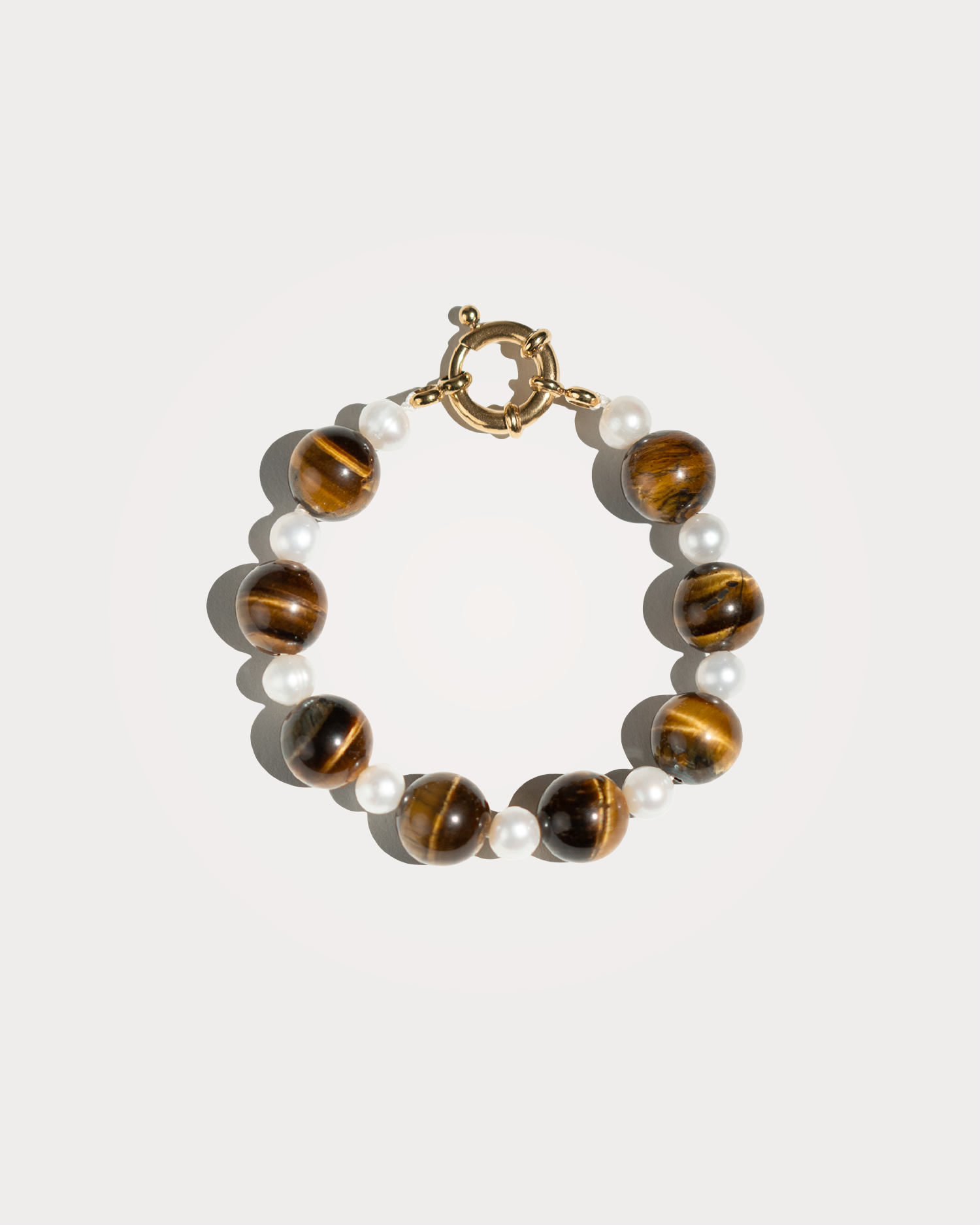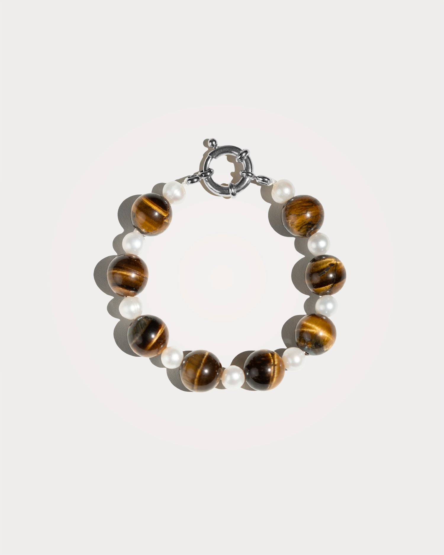 SIERRA, bracciale realizzato interamente a mano in acciaio chirurgico, disponibile sia nella versione in argento che nella versione placcata in oro 18k. È composto da perle di fiume naturali bianche e pietre di Occhio di Tigre marroni sferiche.