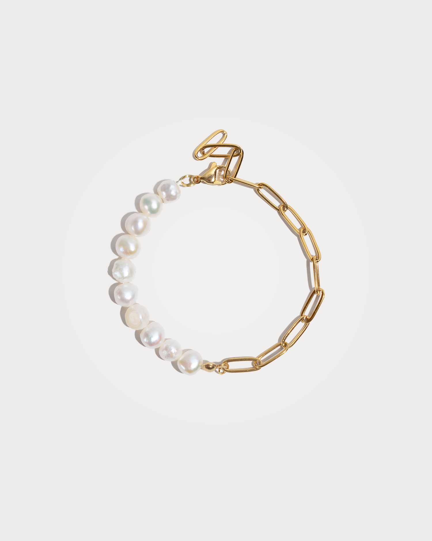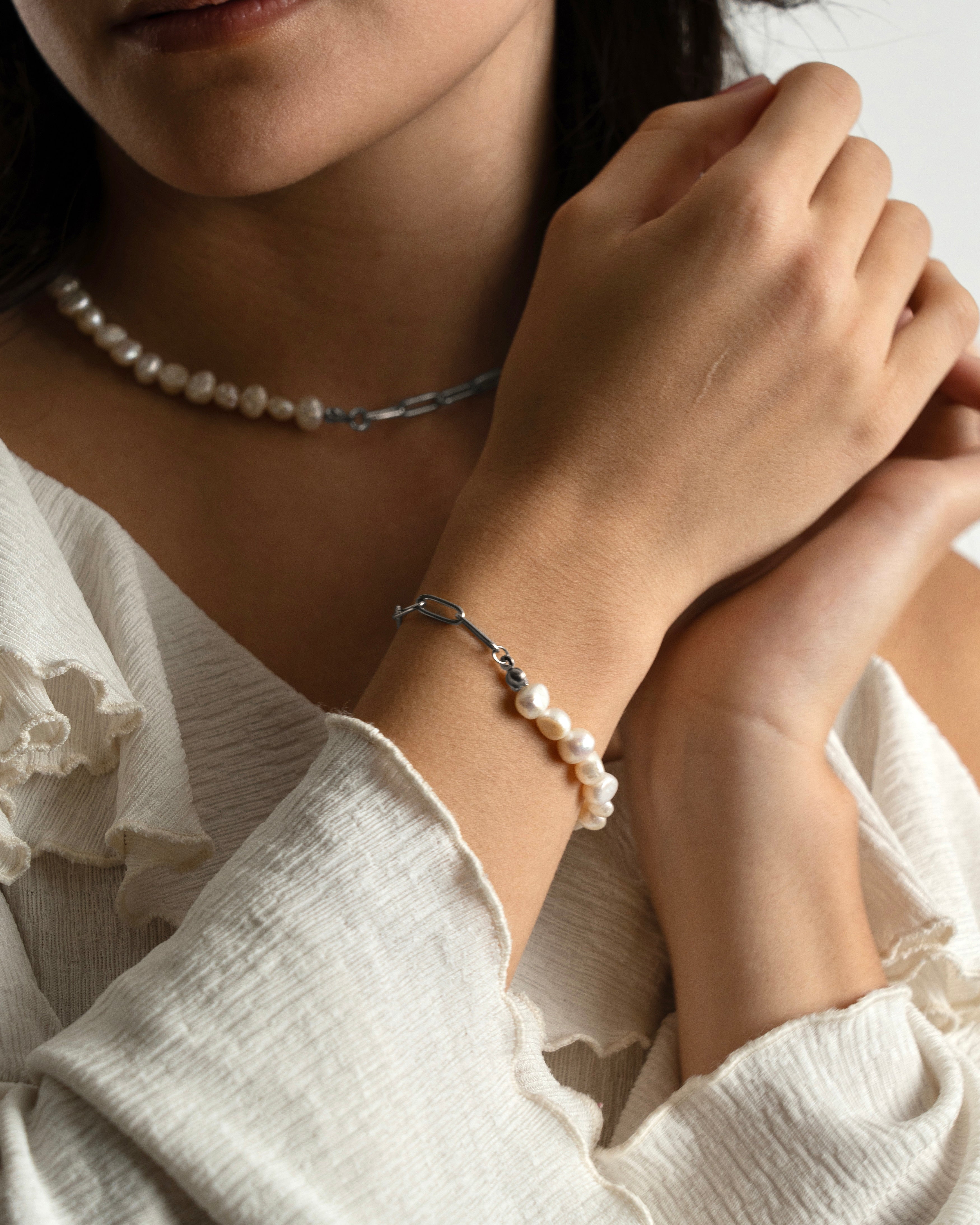 CHLOÉ, bracciale realizzato interamente a mano in acciaio chirurgico, disponibile sia nella versione in argento che nella versione placcata in oro 18k. È composto per metà da perle di fiume naturali ed irregolari, per metà da una catena a maglie grandi rettangolari.