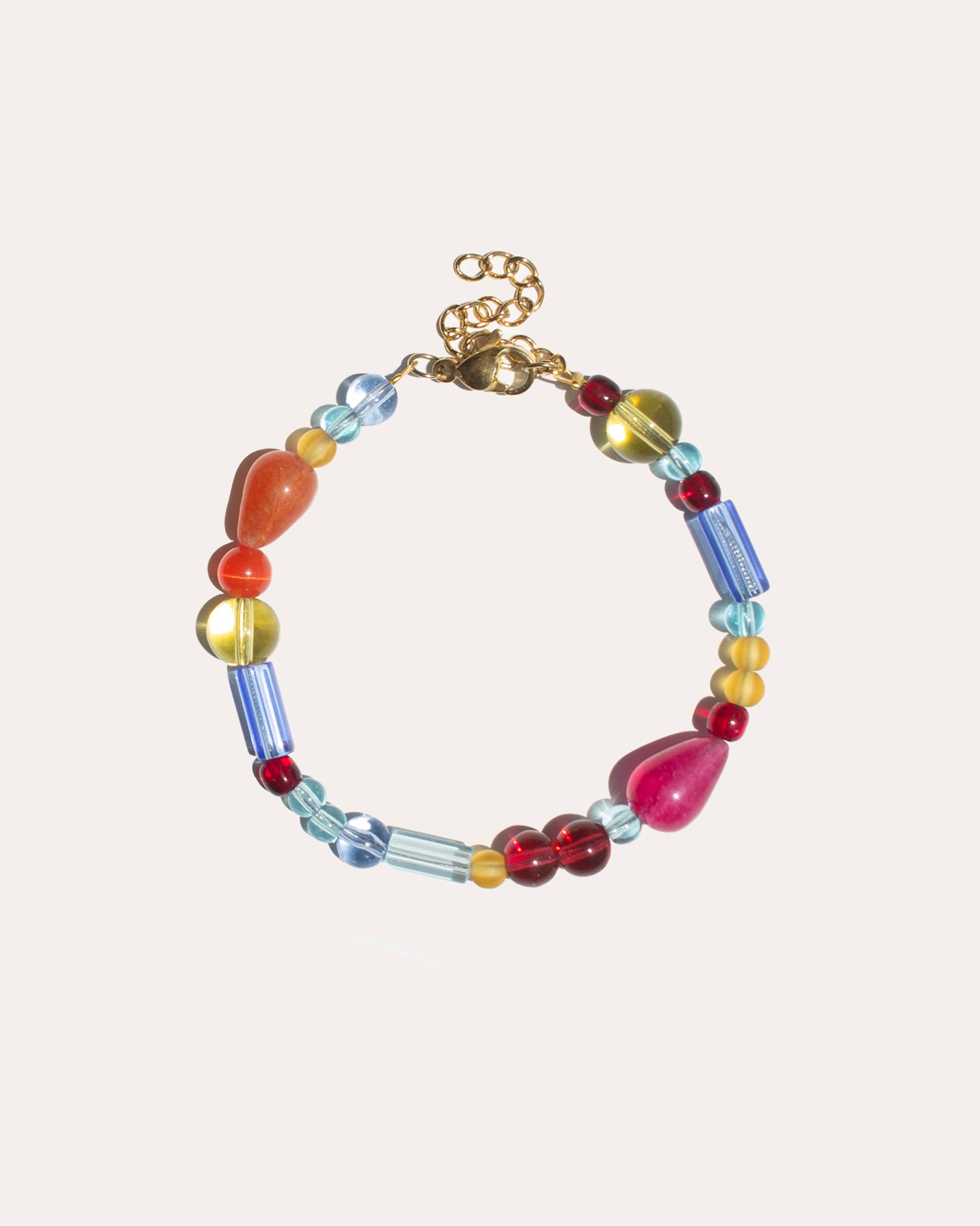 FERRAGOSTO, bracciale realizzato interamente a mano in acciaio chirurgico, disponibile sia nella versione in argento che nella versione placcata in oro 18k. È composto da pietre naturali di Giada colorate (arancioni e fucsia) e perline di vetro colorate.