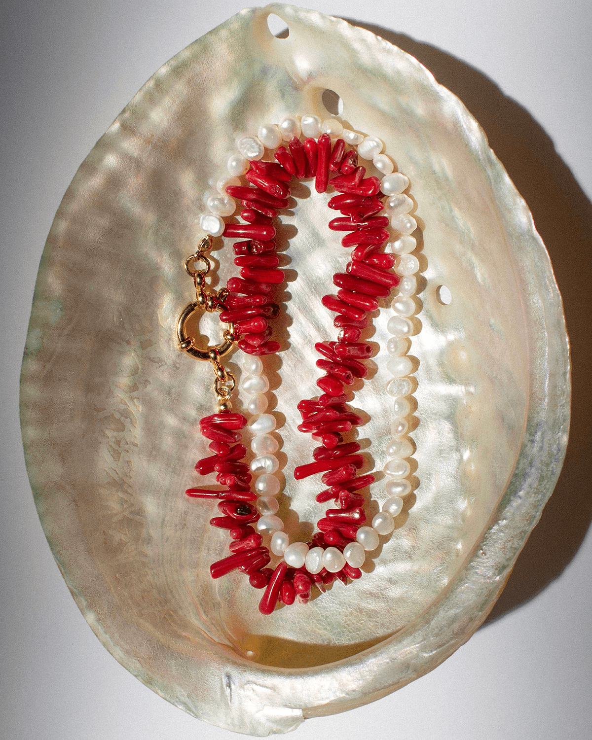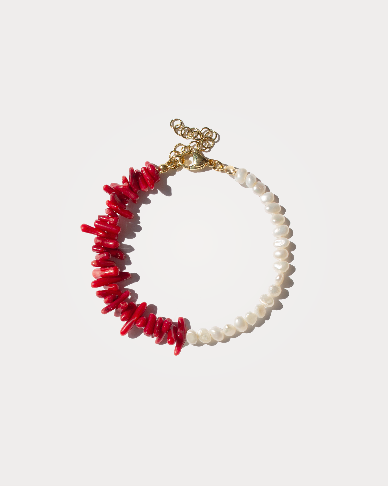 TALULA, bracciale realizzato interamente a mano in acciaio chirurgico, disponibile sia nella versione in argento che nella versione placcata in oro 18k. È composto da perle di fiume naturali irregolari e corallo rosso di bambù.