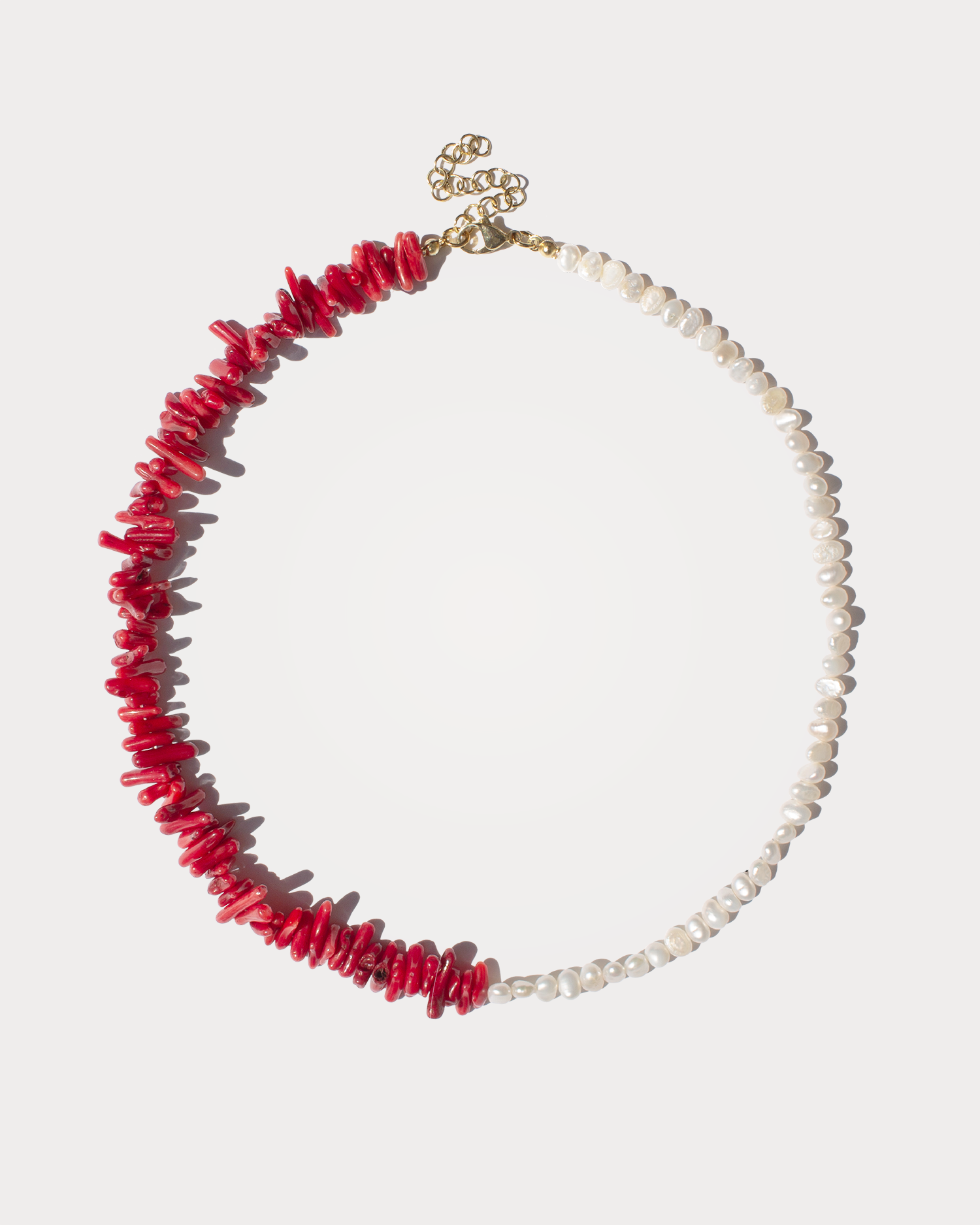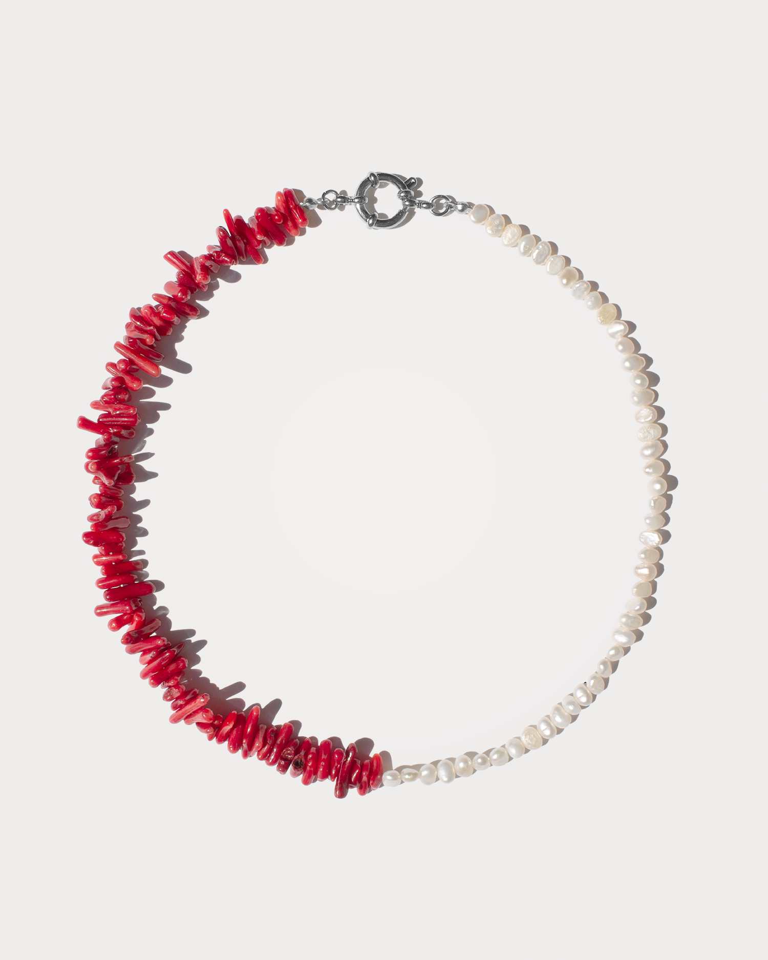 TALULA, collana realizzata interamente a mano in acciaio chirurgico, disponibile sia nella versione in argento che nella versione placcata in oro 18k. È composta da perle di fiume naturali irregolari e corallo di bambù naturale, è inoltre possibile scegliere tra due chiusure diverse.