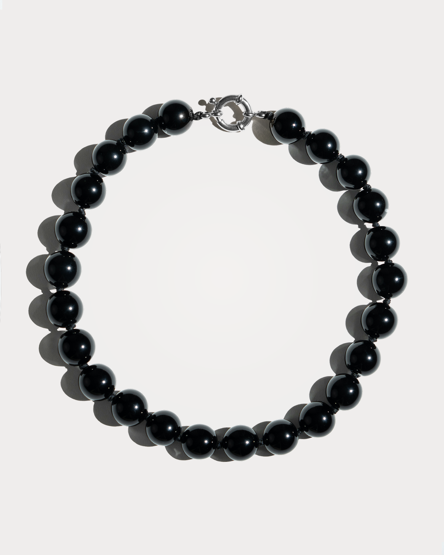 OPHELIA, collana realizzata interamente a mano in acciaio chirurgico, disponibile sia nella versione in argento che nella versione placcata in oro 18k. È composta da pietre naturali di Onice nere e sferiche, è inoltre possibile scegliere tra due chiusure diverse