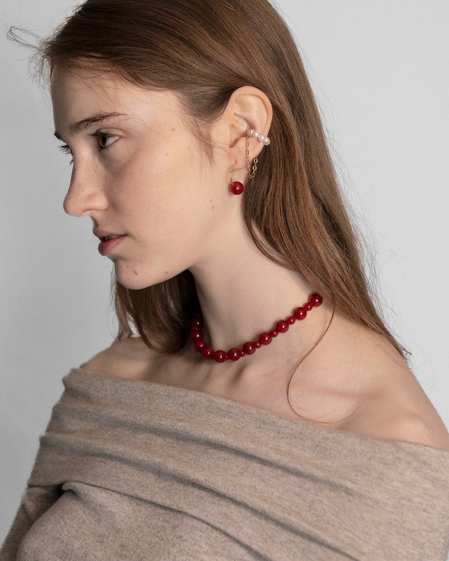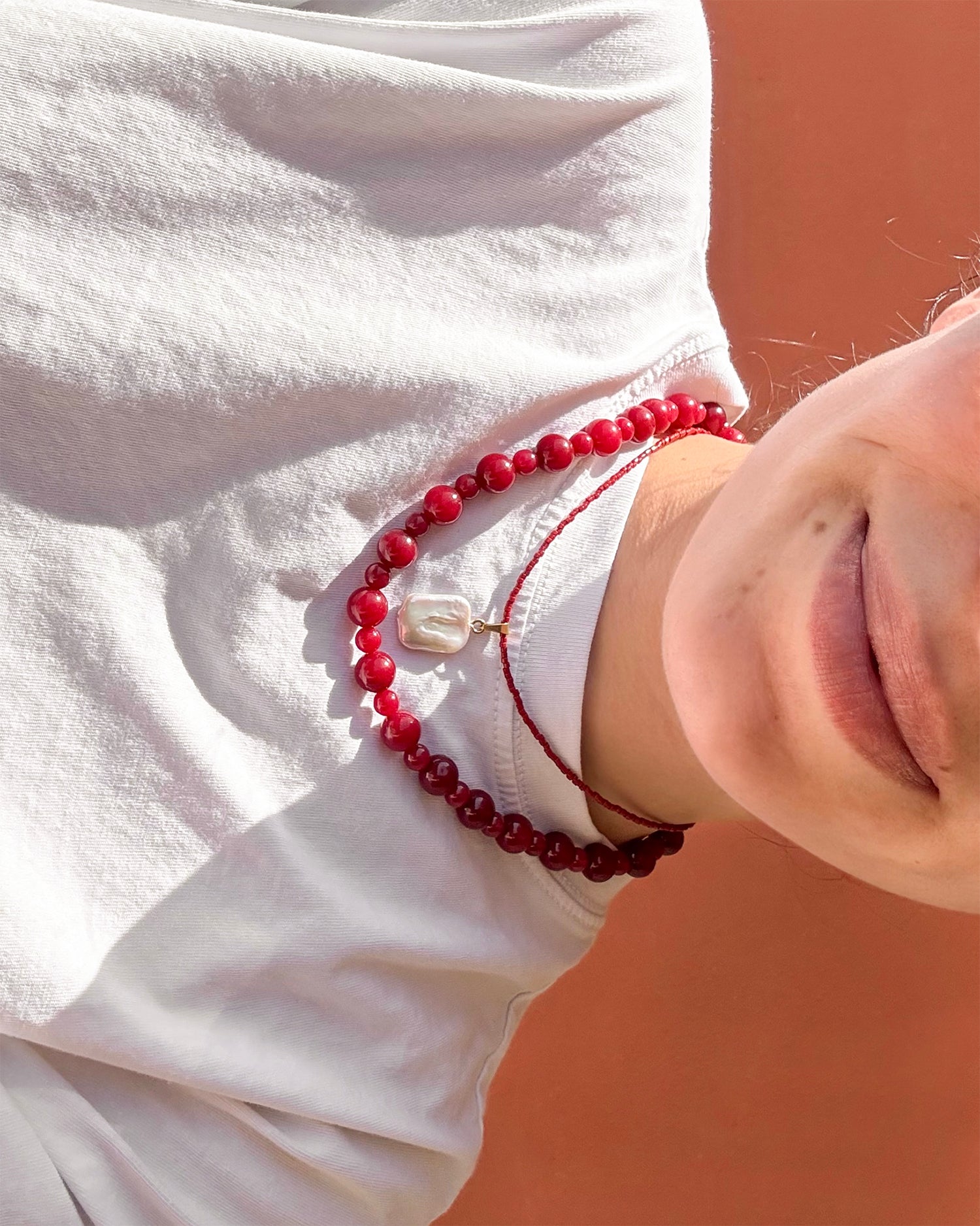 Sovana, collana realizzata interamente a mano in acciaio chirurgico, disponibile sia nella versione in argento che nella versione placcata in oro 18k. È composta da pietre naturali di Agata rosso rubino sferiche alternate in due diverse dimensioni, è inoltre possibile scegliere tra due chiusure diverse