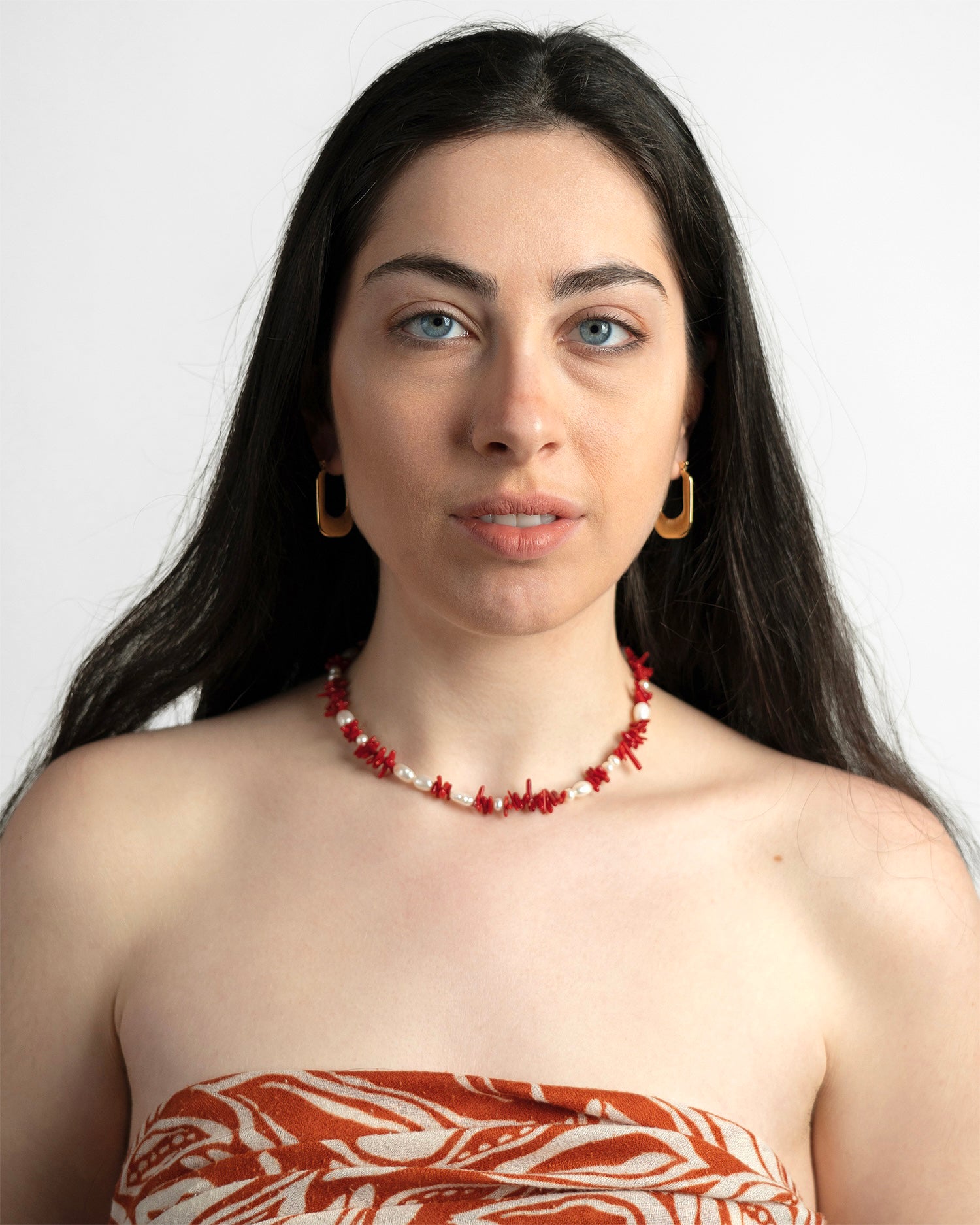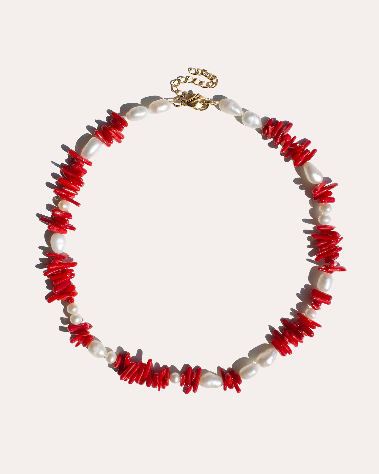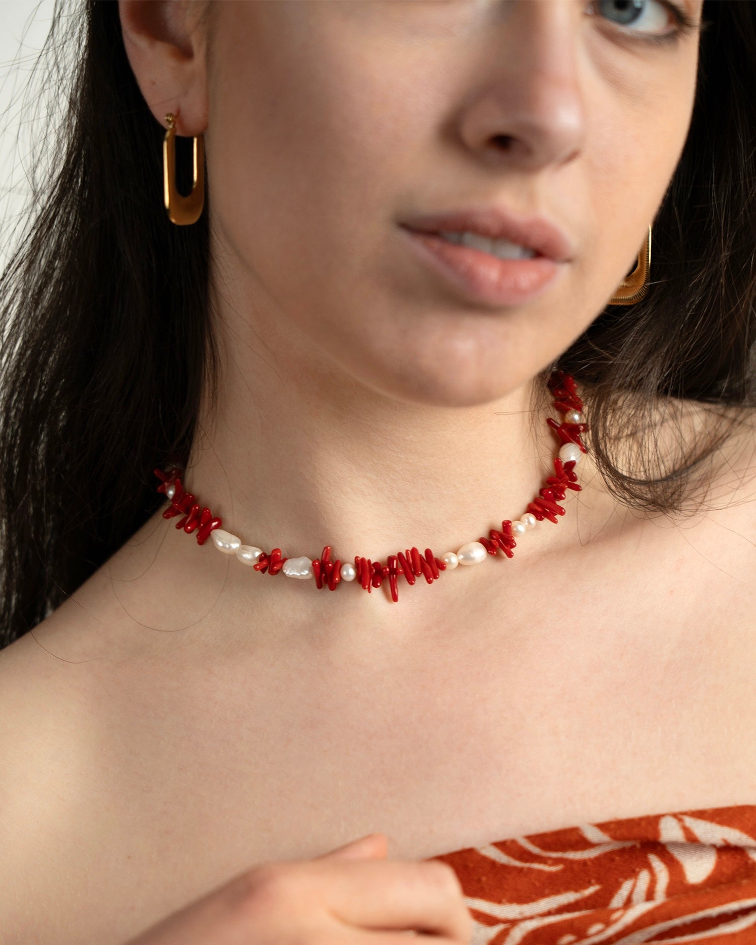 SELAROSE, collana realizzata interamente a mano in acciaio chirurgico, disponibile sia nella versione in argento che nella versione placcata in oro 18k. È composta da corallo di bambù rosso e perle di fiume naturali e irregolari, è inoltre possibile scegliere tra due chiusure diverse.