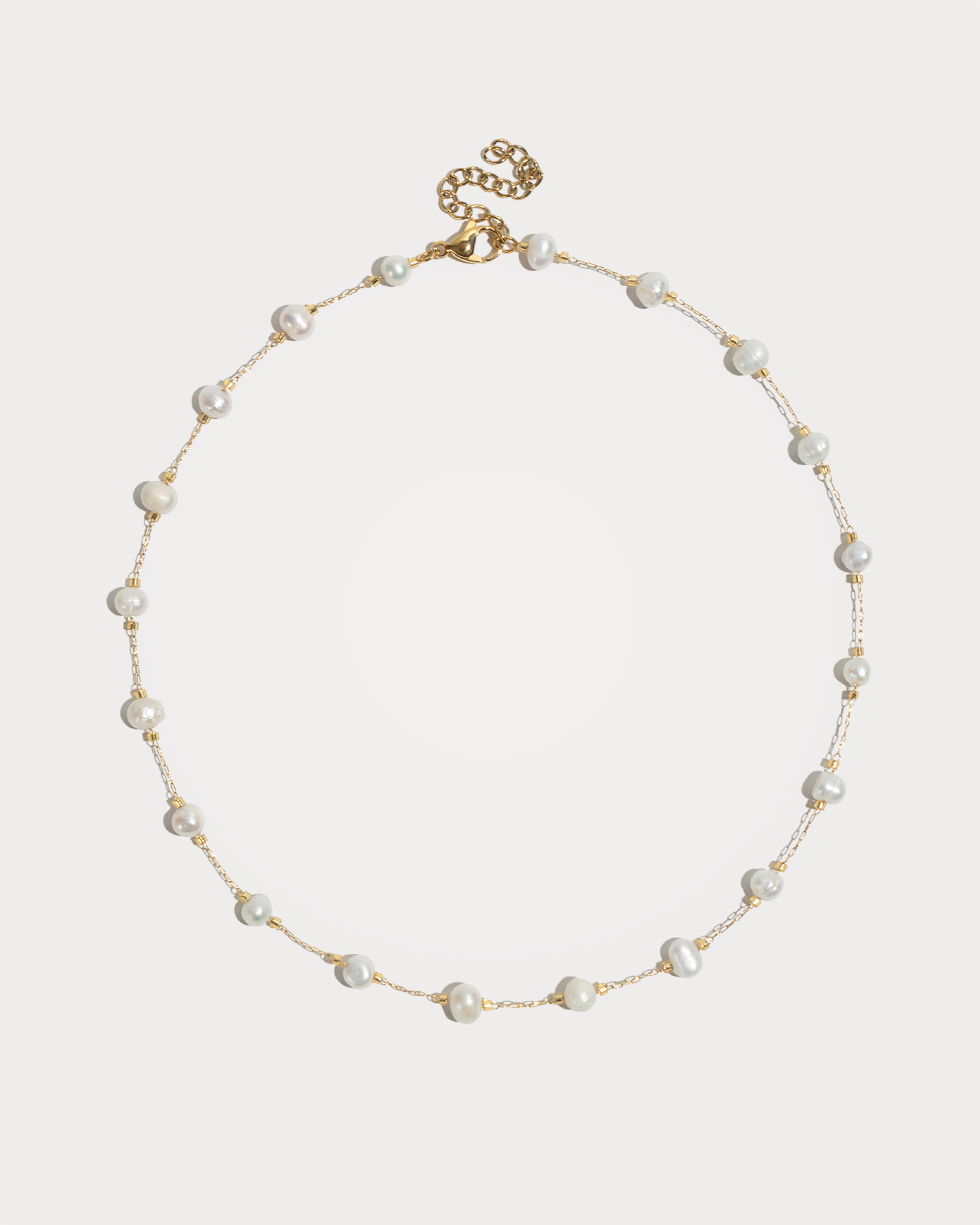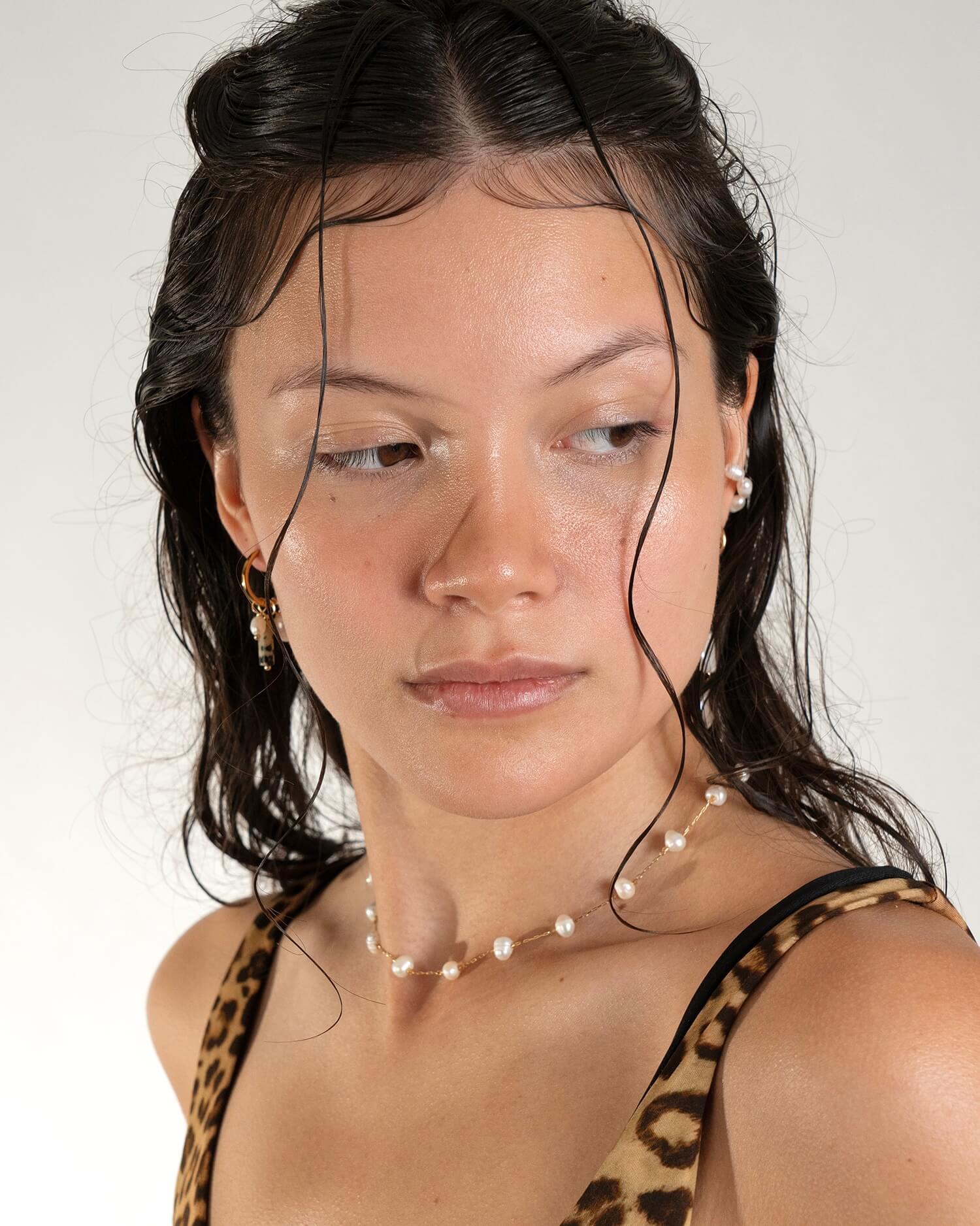 Vanelia, collana realizzata interamente a mano in acciaio chirurgico, caratterizzata dalla lucentezza della sua placcatura in oro 18k. È composta da perle di fiume naturali ed irregolari disposte lungo una sottile catenina.