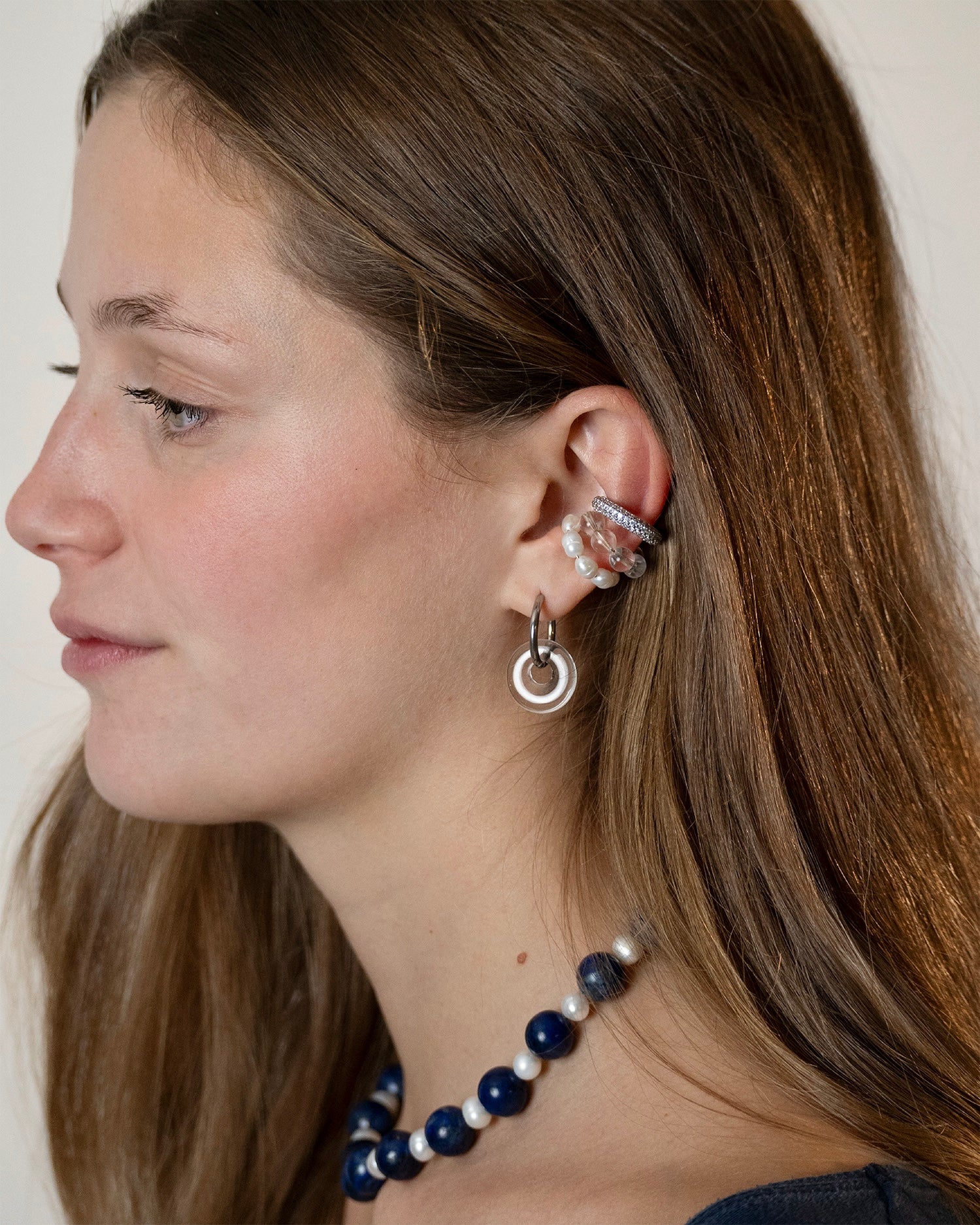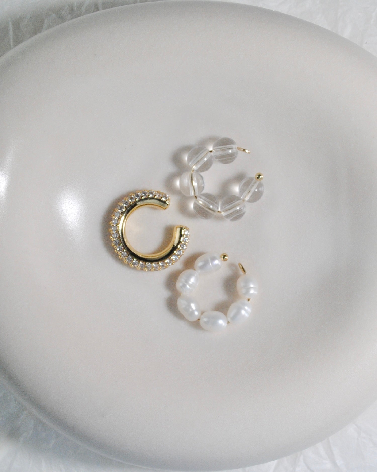 Set LIGHT EBONY, set di tre ear cuffs realizzati interamente inacciaio chirurgico e in ottone nickel free, disponibili sia nella versione in argento che nella versione placcata in oro 18k. Sono composti da perle di fiume naturali, pietre di Cristallo di Rocca e zirconi argentati. Funzionano ad incastro: possono essere indossato facendogli avvolgere il lobo!