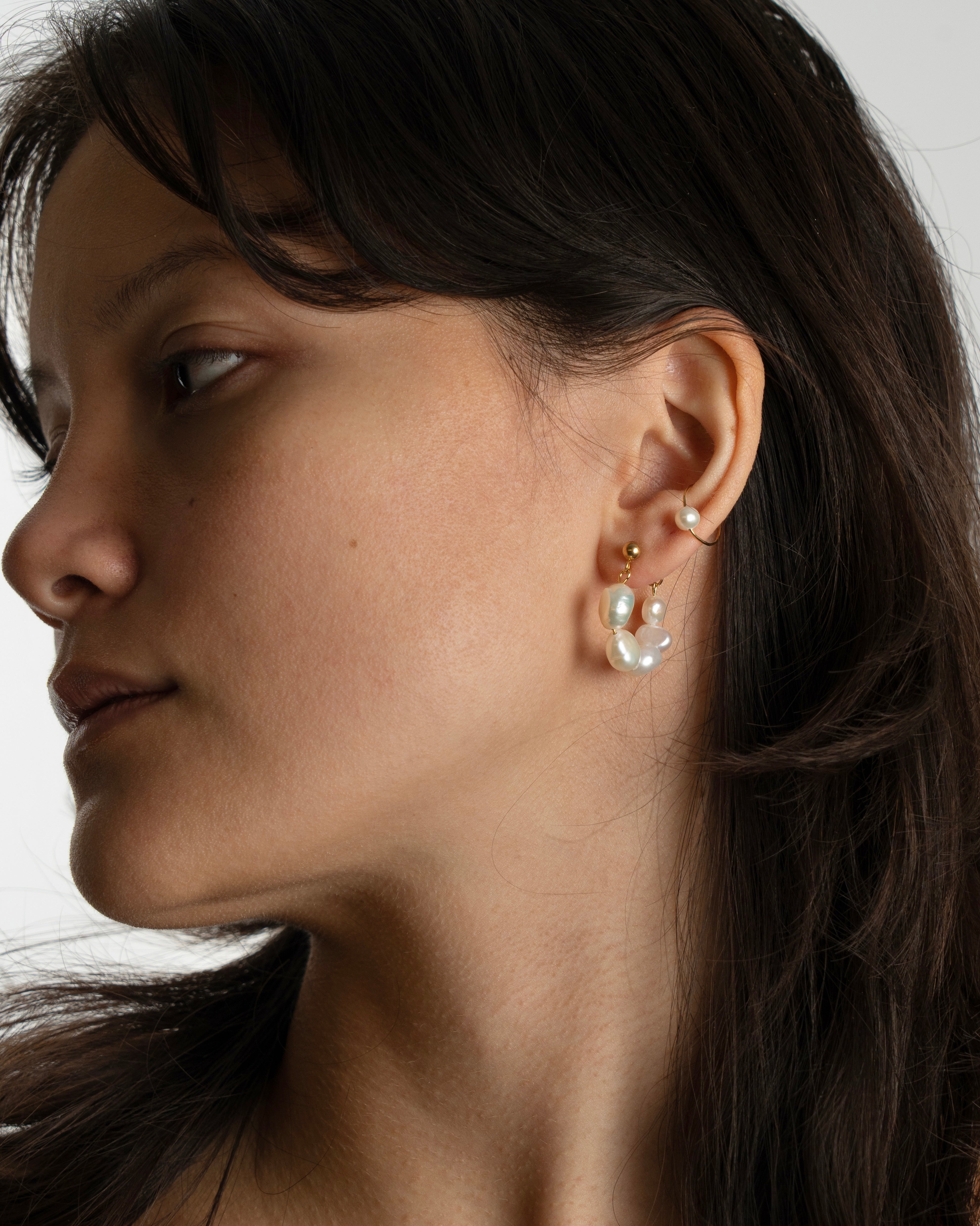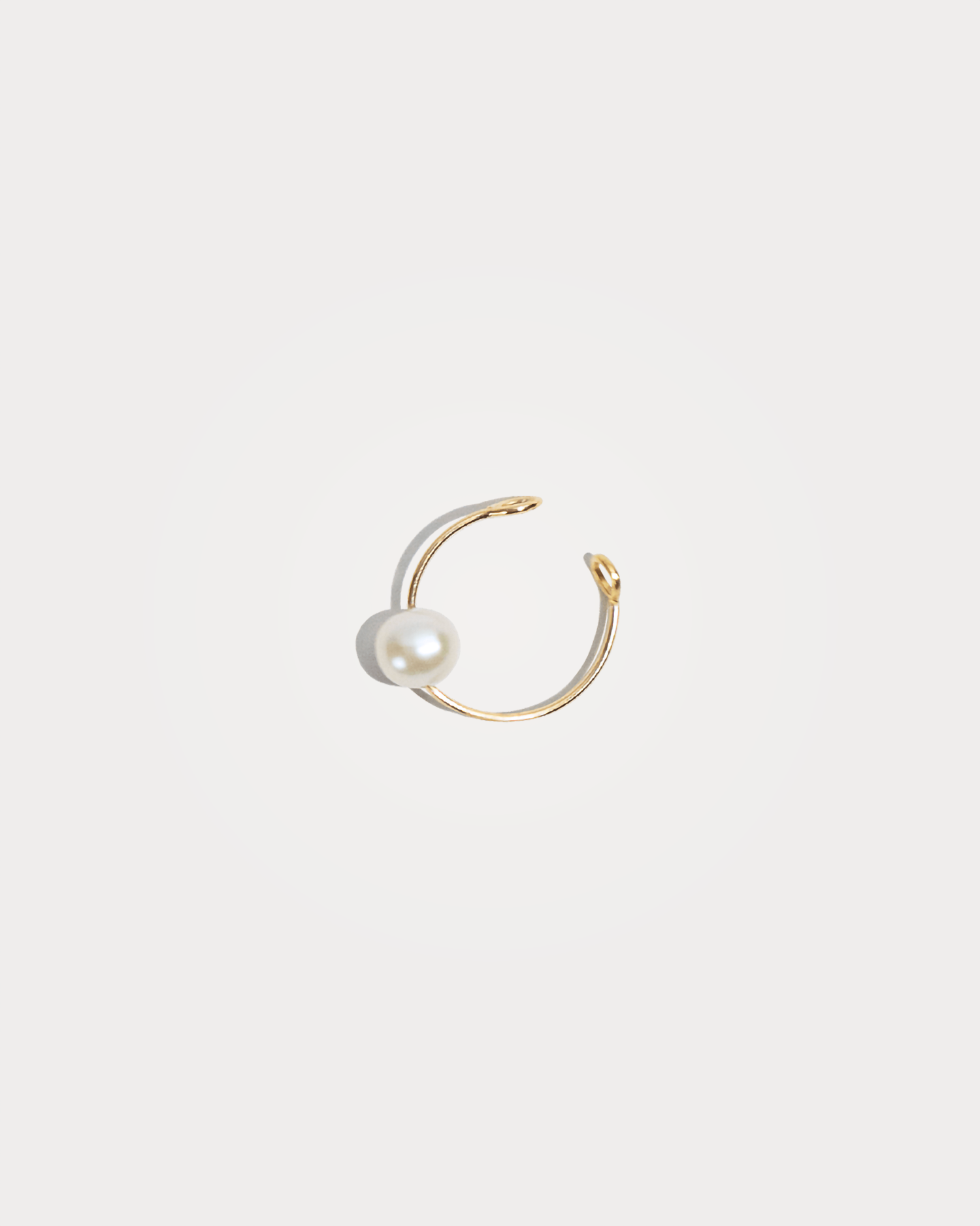 MARIAM, ear cuff realizzato interamente a mano in acciaio chirurgico, disponibile sia nella versione in argento che nella versione placcata in oro 18k. È composto da una perla di fiume naturale tonda e da un cavo in acciaio modellato. Funziona ad incastro: può essere modellato ed indossato facendolo aderire all'orecchio!