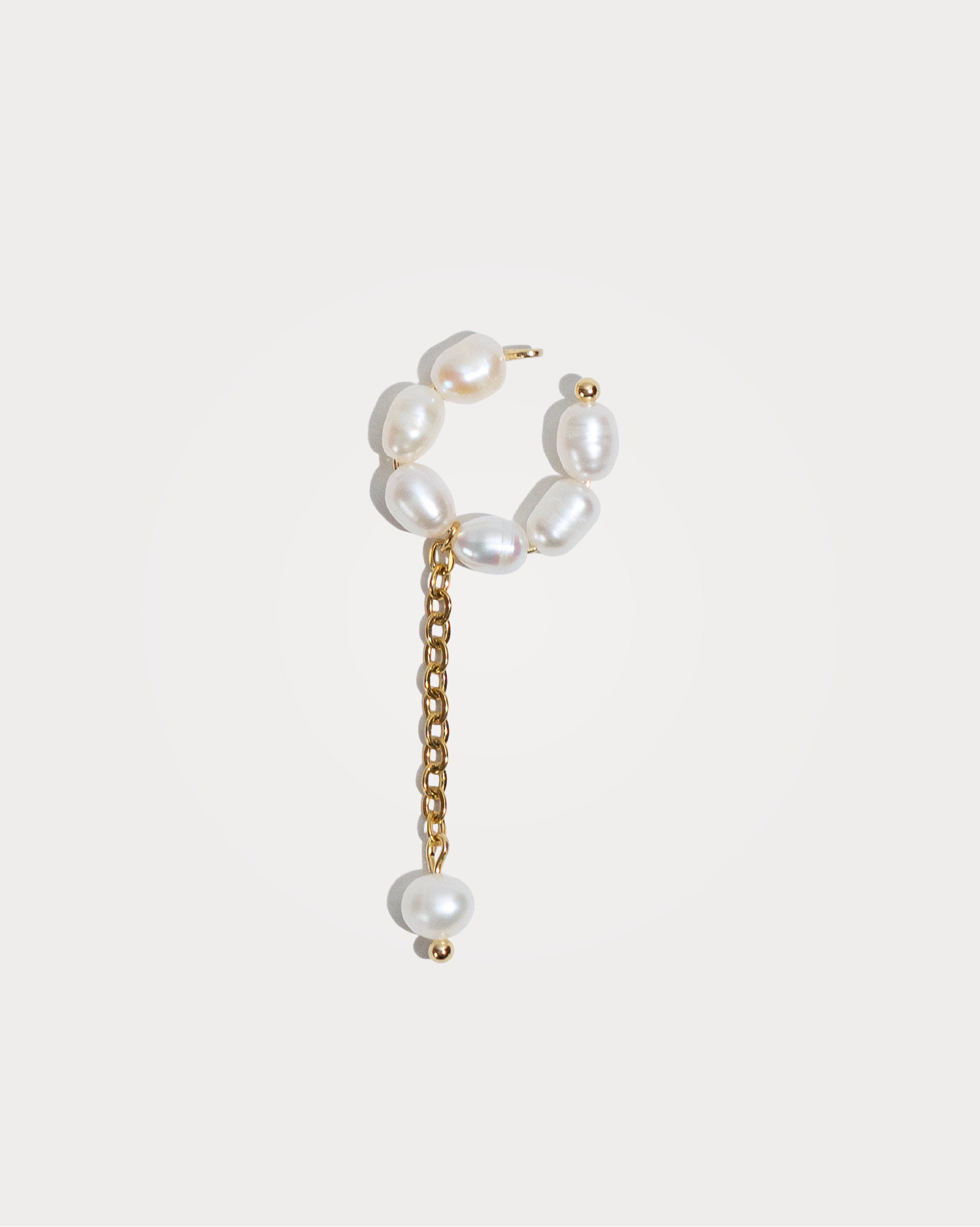 NORA, ear cuff realizzato interamente a mano in acciaio chirurgico, disponibili sia nella versione in argento che nella versione placcata in oro 18k. È composto da sei perle di fiume naturali bianche e da un ciondolo pendente con una perla di fiume tonda. Funziona ad incastro: può essere modellato ed indossato facendolo aderire all'orecchio!