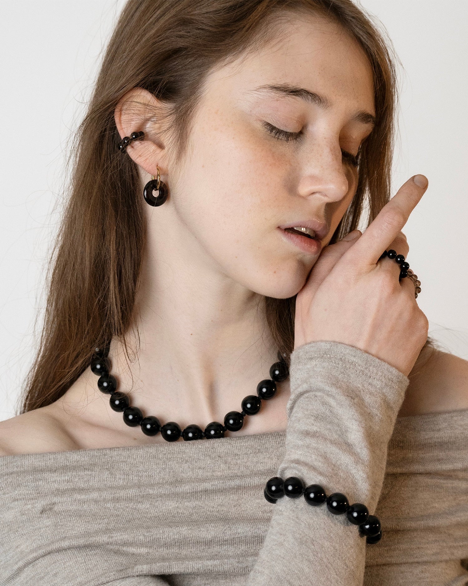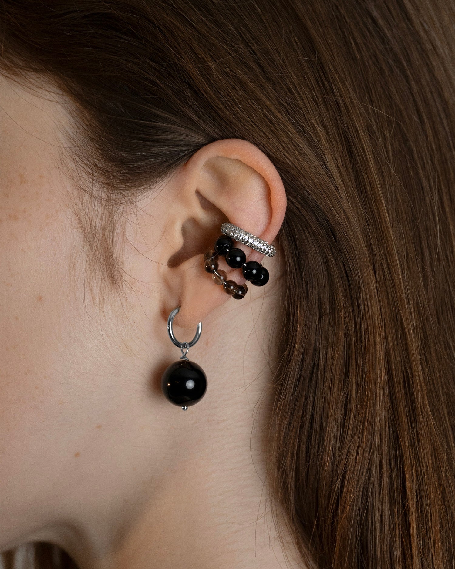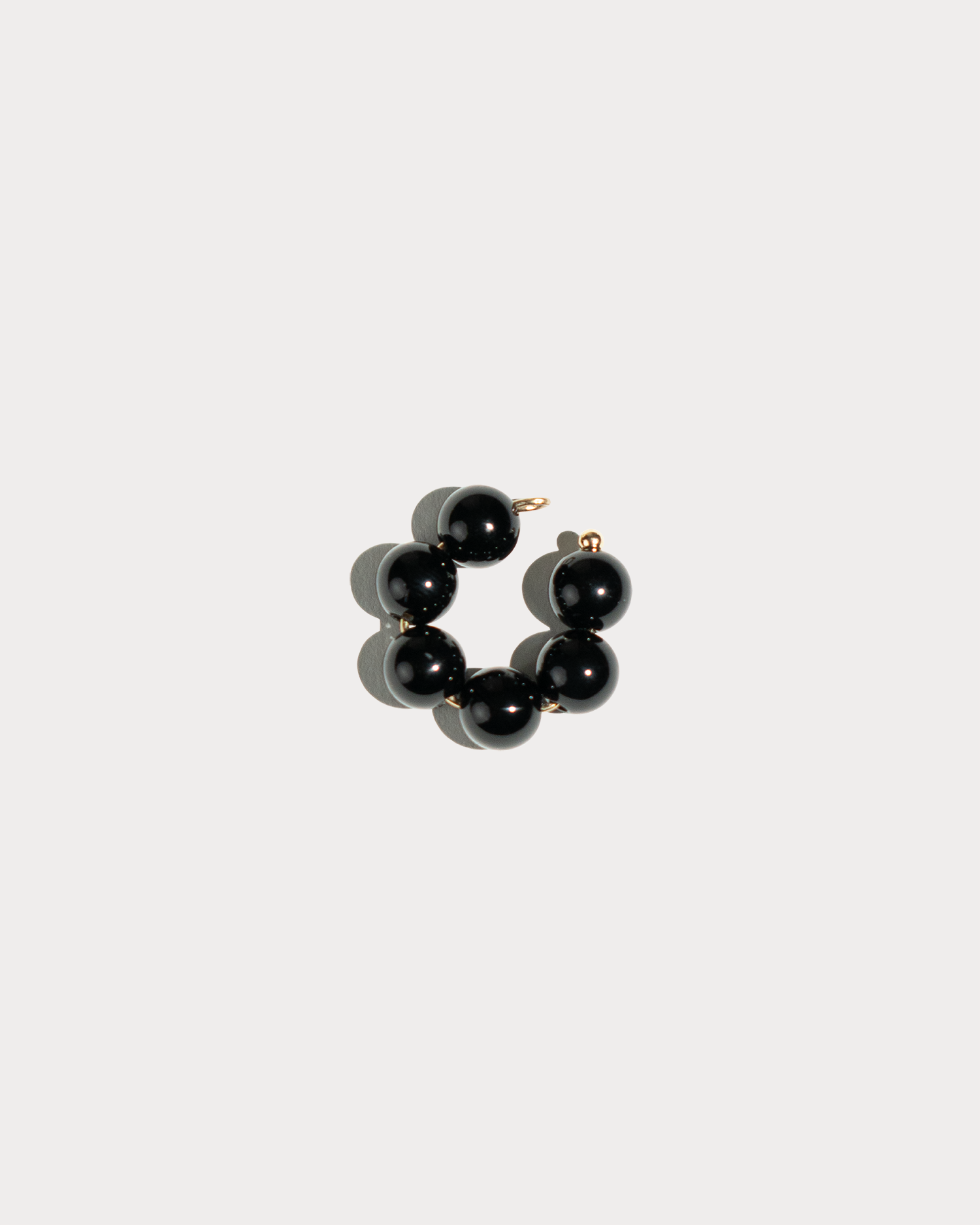 OPHELIA, ear cuff realizzato interamente a mano in acciaio chirurgico, disponibile sia nella versione in argento che nella versione placcata in oro 18k. È composto da sei pietre naturali di Onice nero. Funziona ad incastro: può essere modellato ed indossato facendolo aderire all'orecchio!