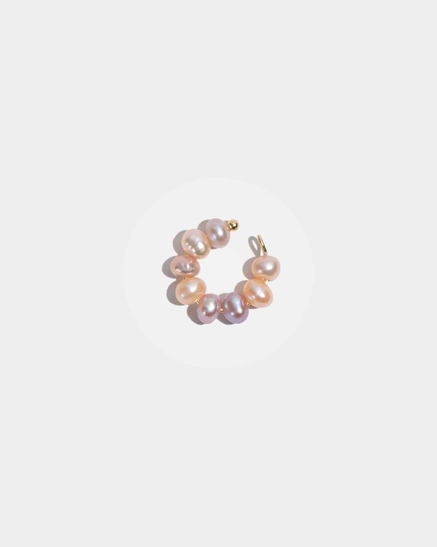 PRUNA, ear cuff realizzato interamente a mano in acciaio chirurgico, disponibili sia nella versione in argento che nella versione placcata in oro 18k. È composto da otto perle di fiume naturali ed irregolari sulle tonalità del rosa, sempre diverse. Funziona ad incastro: può essere modellato ed indossato facendolo aderire all'orecchio!