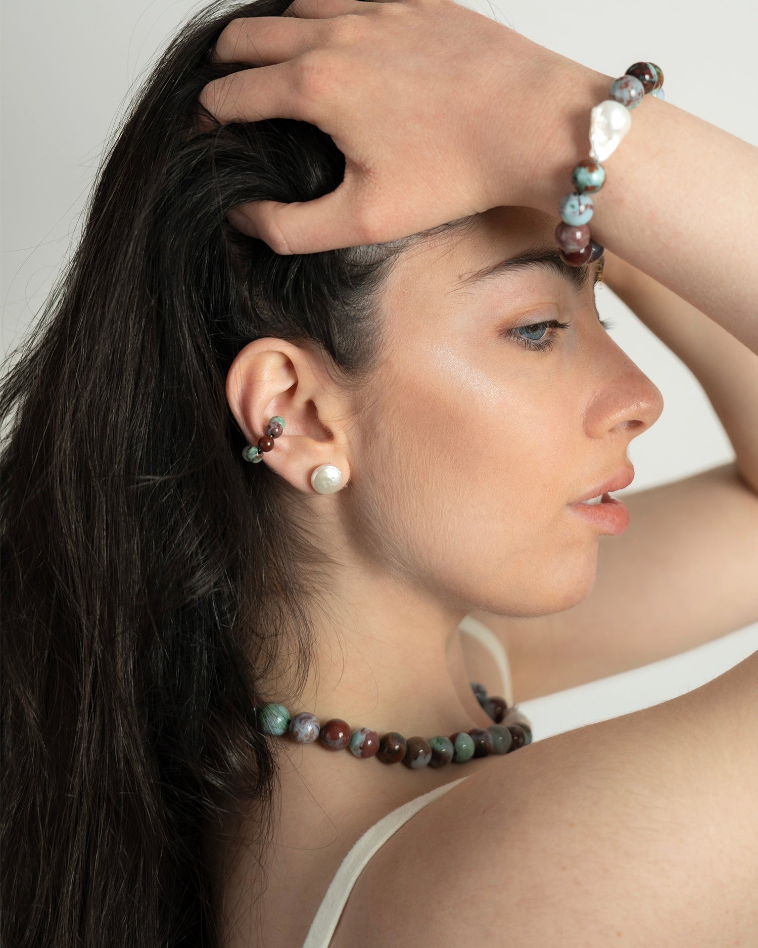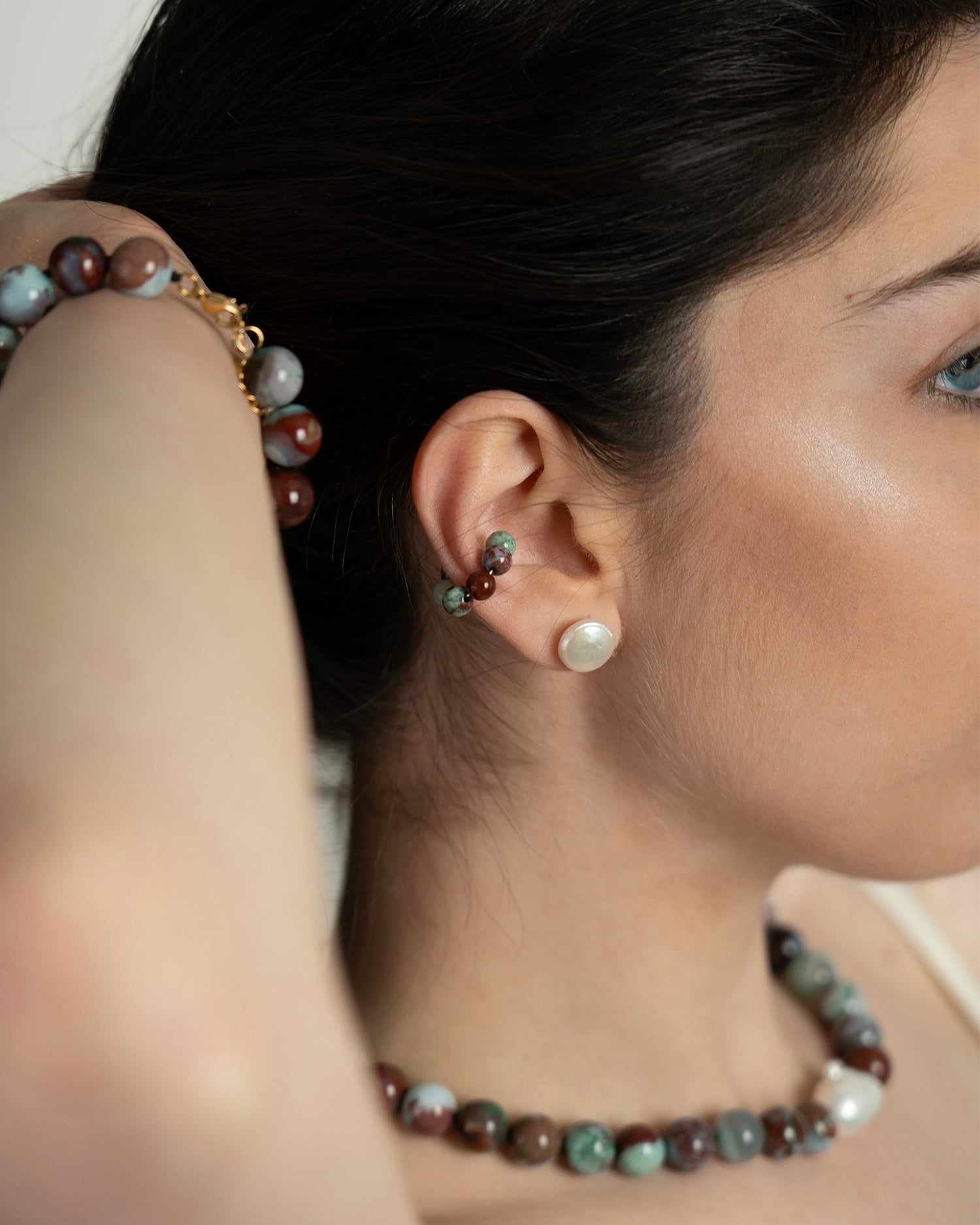 SIRENA, ear cuff realizzato interamente a mano in acciaio chirurgico, disponibile sia nella versione in argento che nella versione placcata in oro 18k. È composto da sei pietre naturali di Diaspro multicolor sferiche. Funziona ad incastro: può essere modellato ed indossato facendolo aderire all'orecchio!