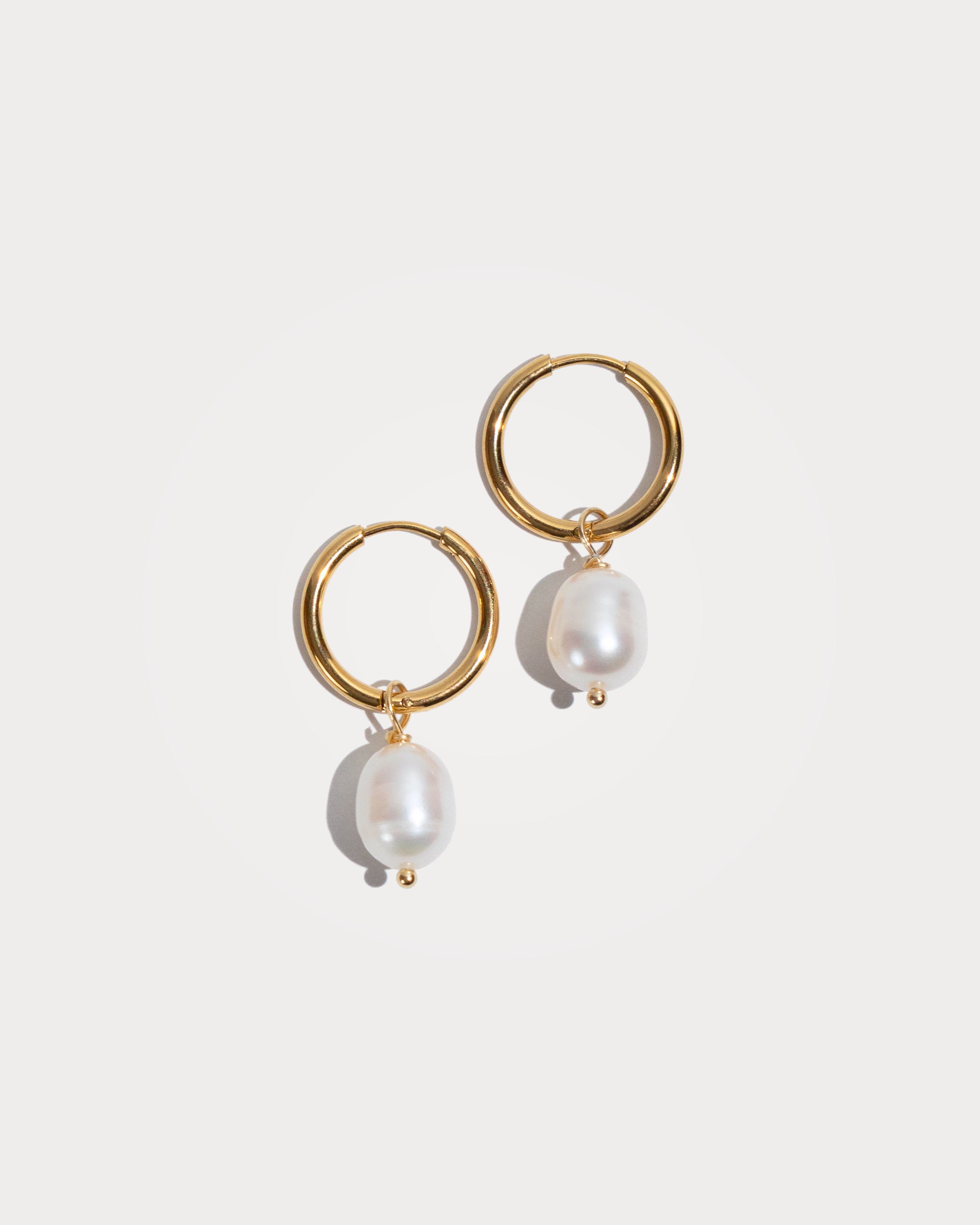 CÉLINE, orecchini realizzati interamente a mano in acciaio chirurgico, disponibili sia nella versione in argento che nella versione placcata in oro 18k. Sono composti ognuno da un ciondolo con una perla di fiume naturale bianca ovale.