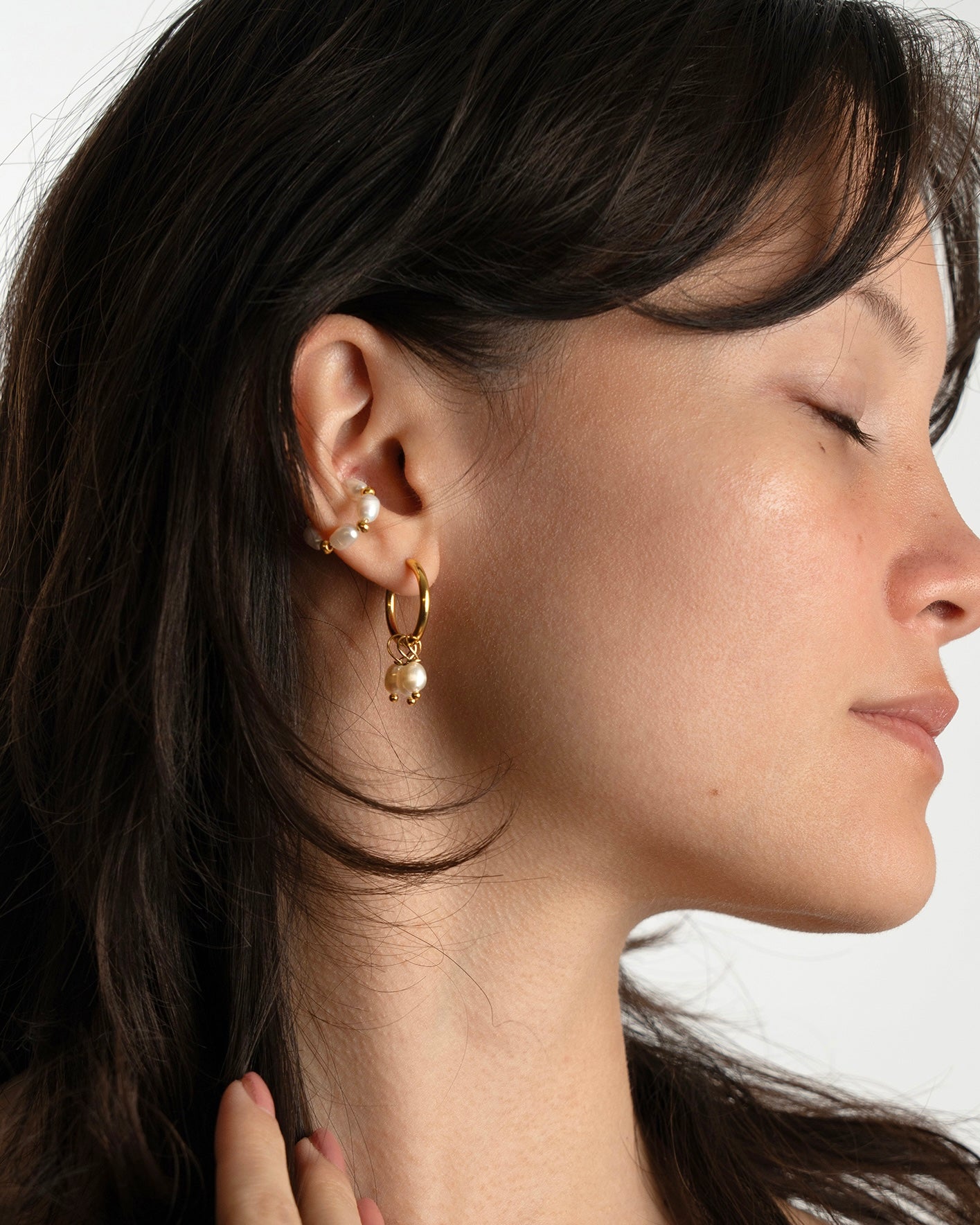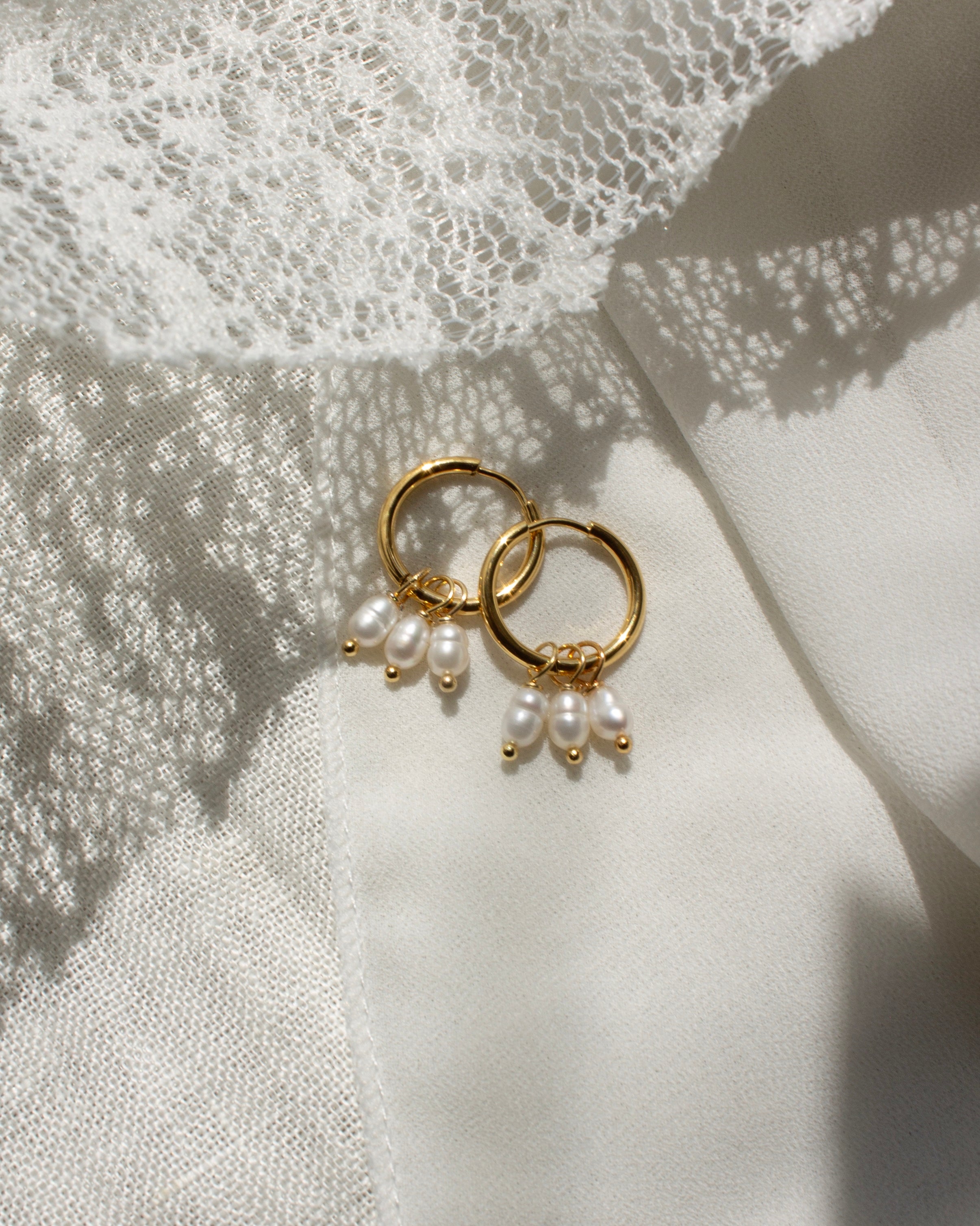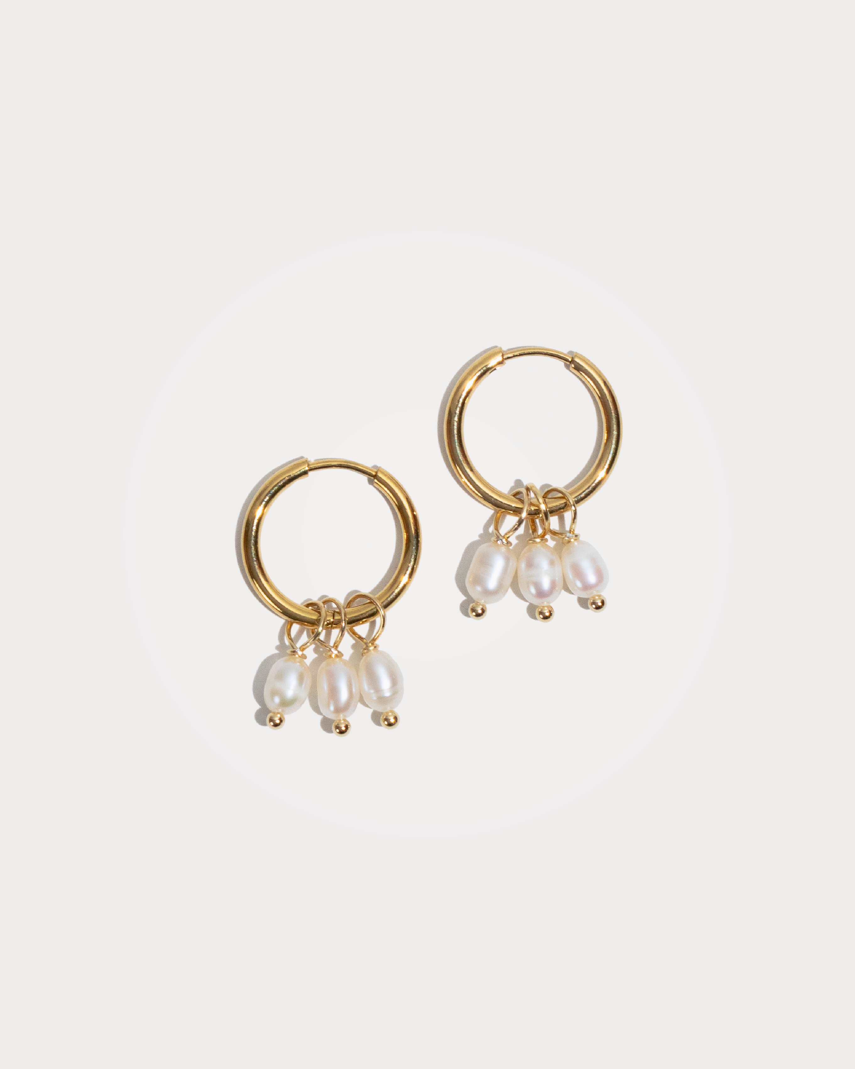 MISA, orecchini realizzati interamente a mano in acciaio chirurgico, disponibili sia nella versione in argento che nella versione placcata in oro 18k. Sono composti ognuno da tre ciondoli con una piccola perla di fiume naturale bianca.