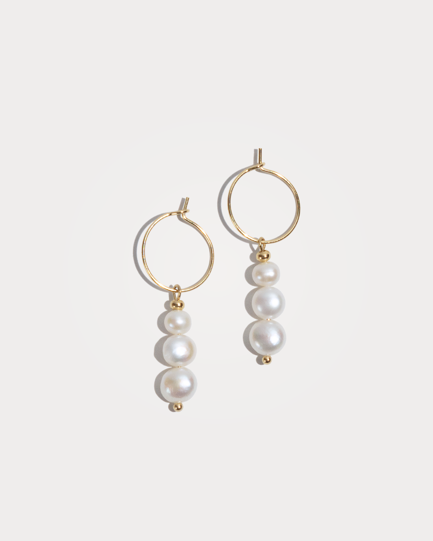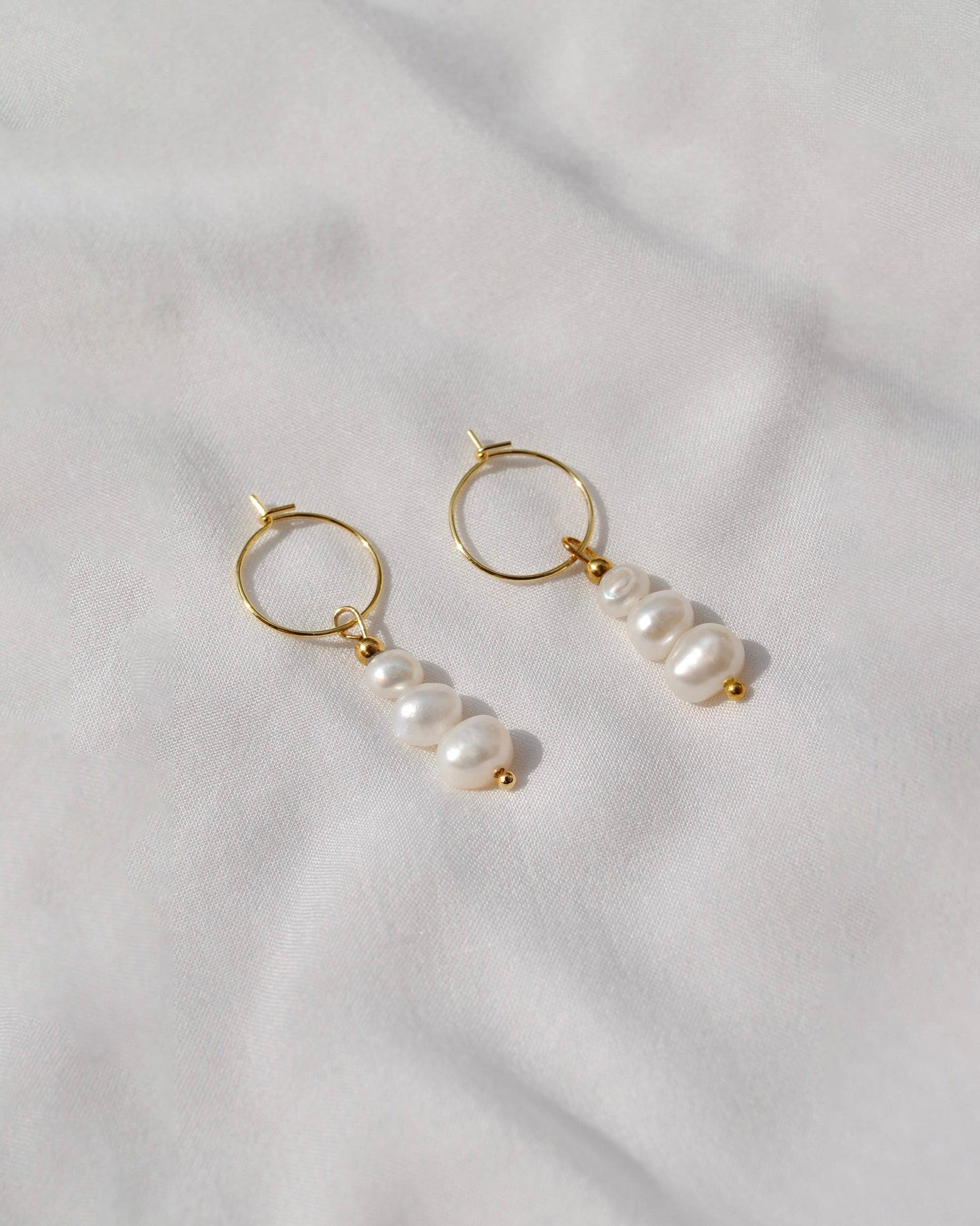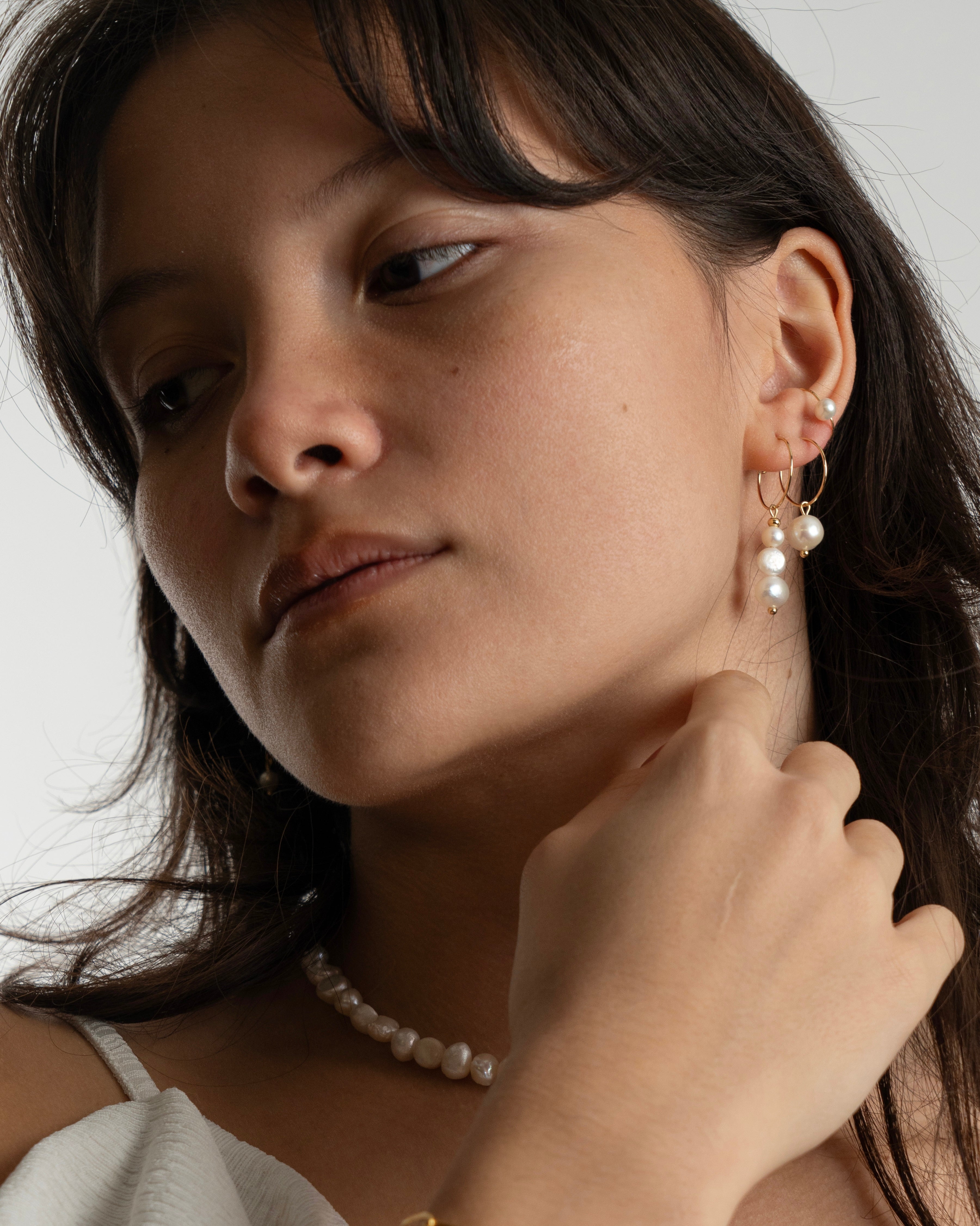 MYA, orecchini realizzati interamente a mano in acciaio chirurgico, disponibili sia nella versione in argento che nella versione placcata in oro 18k. Sono composti da sottili cerchi modellabili ed ognuno da un ciondolo con tre perle di fiume naturali bianche e una sfera in acciaio.