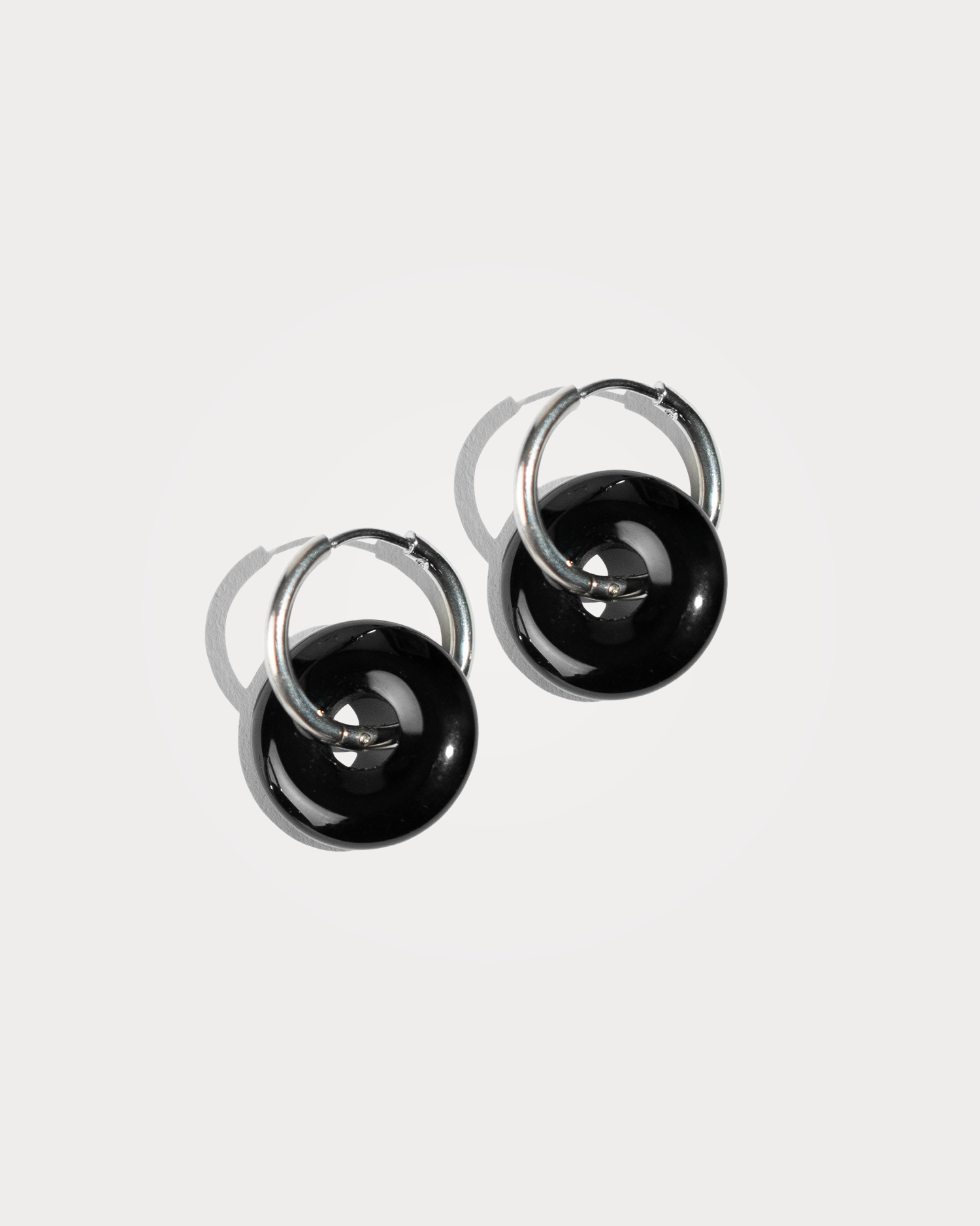 RUNA, orecchini realizzati interamente a mano in acciaio chirurgico, disponibili sia nella versione in argento che nella versione placcata in oro 18k. Sono composti ognuno da un ciondolo tondo e piatto di Agata nera naturale a forma di ciambella.