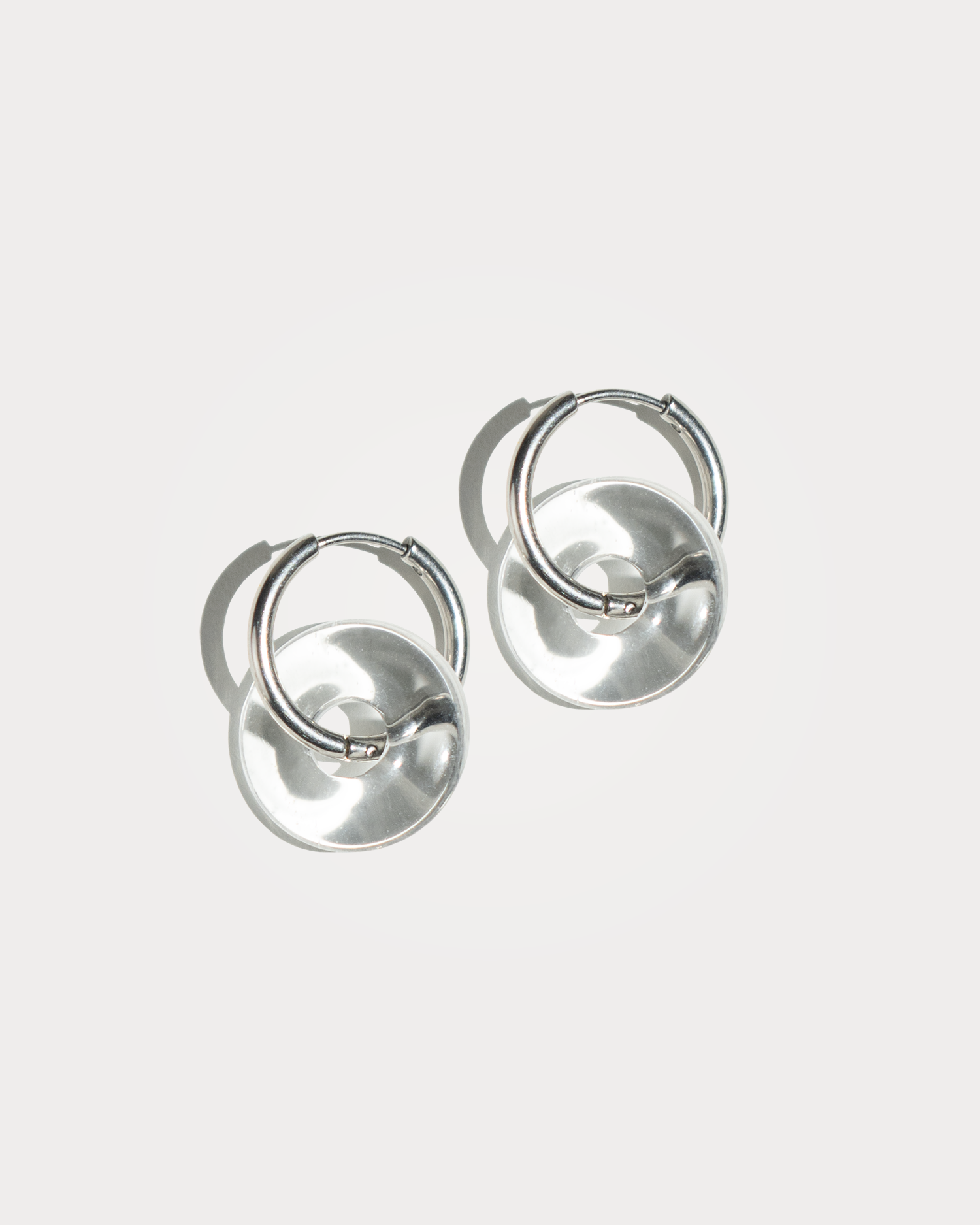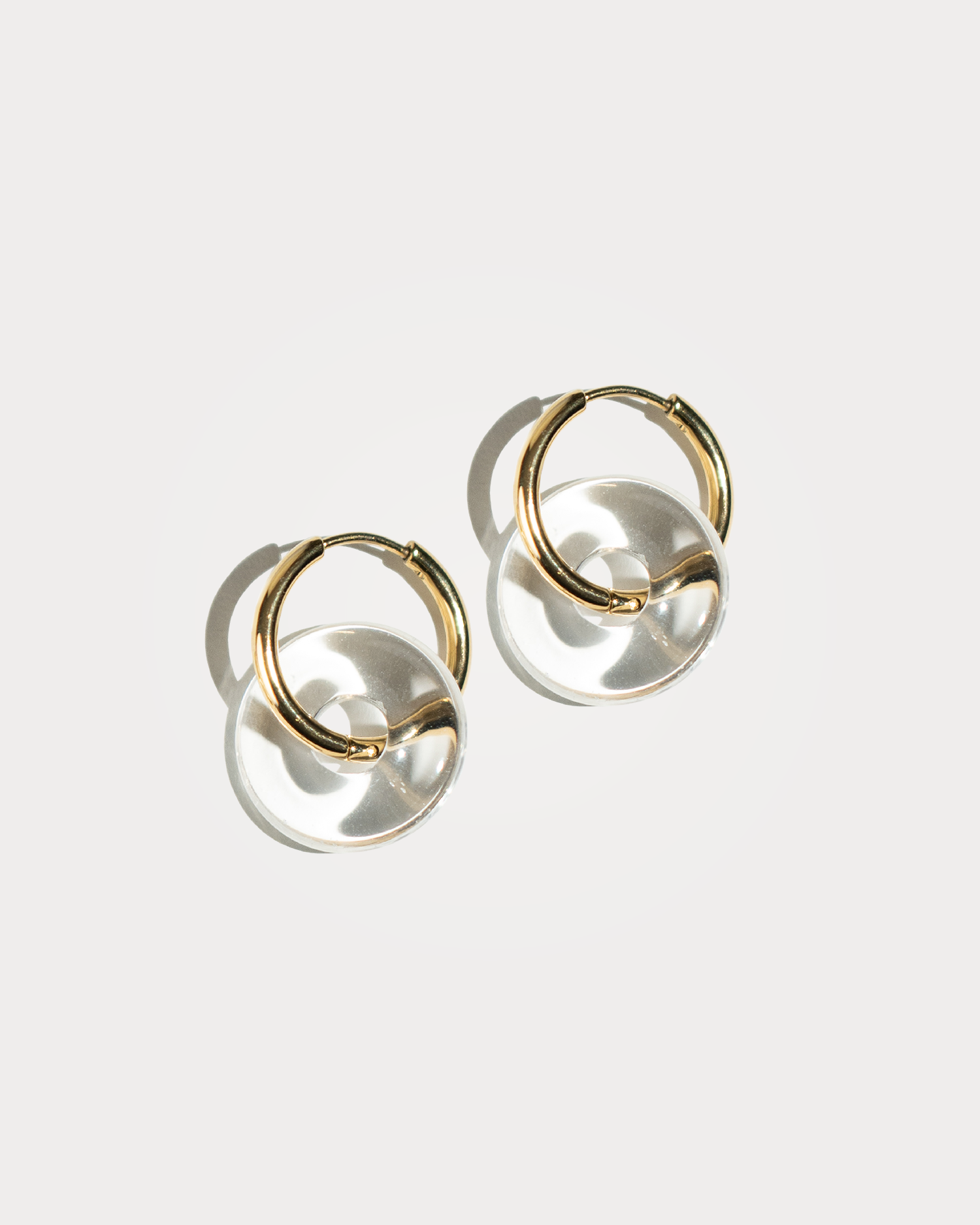 RUNA, orecchini realizzati interamente a mano in acciaio chirurgico, disponibili sia nella versione in argento che nella versione placcata in oro 18k. Sono composti ognuno da un ciondolo tondo e piatto di Cristallo di Rocca trasparente naturale a forma di ciambella.