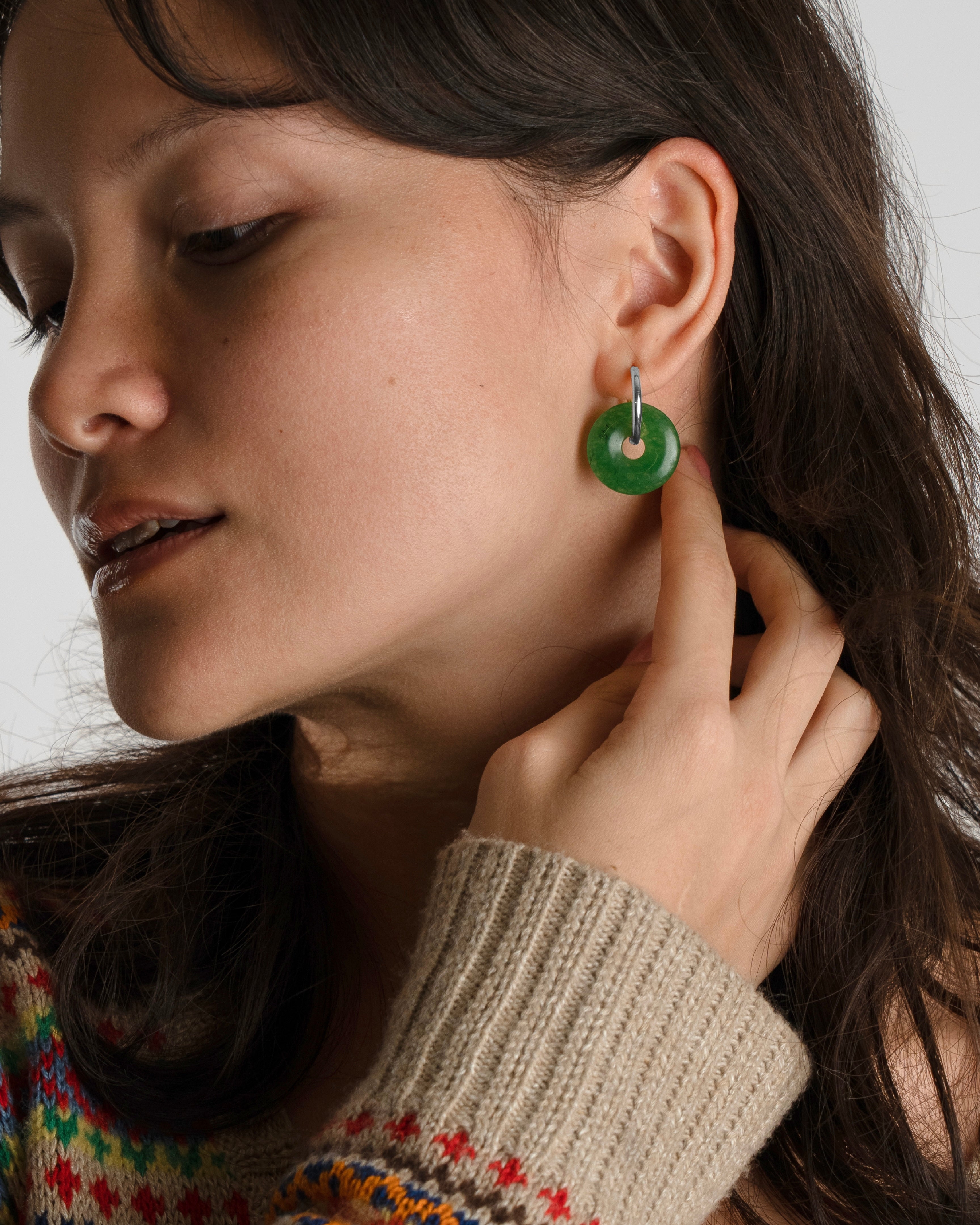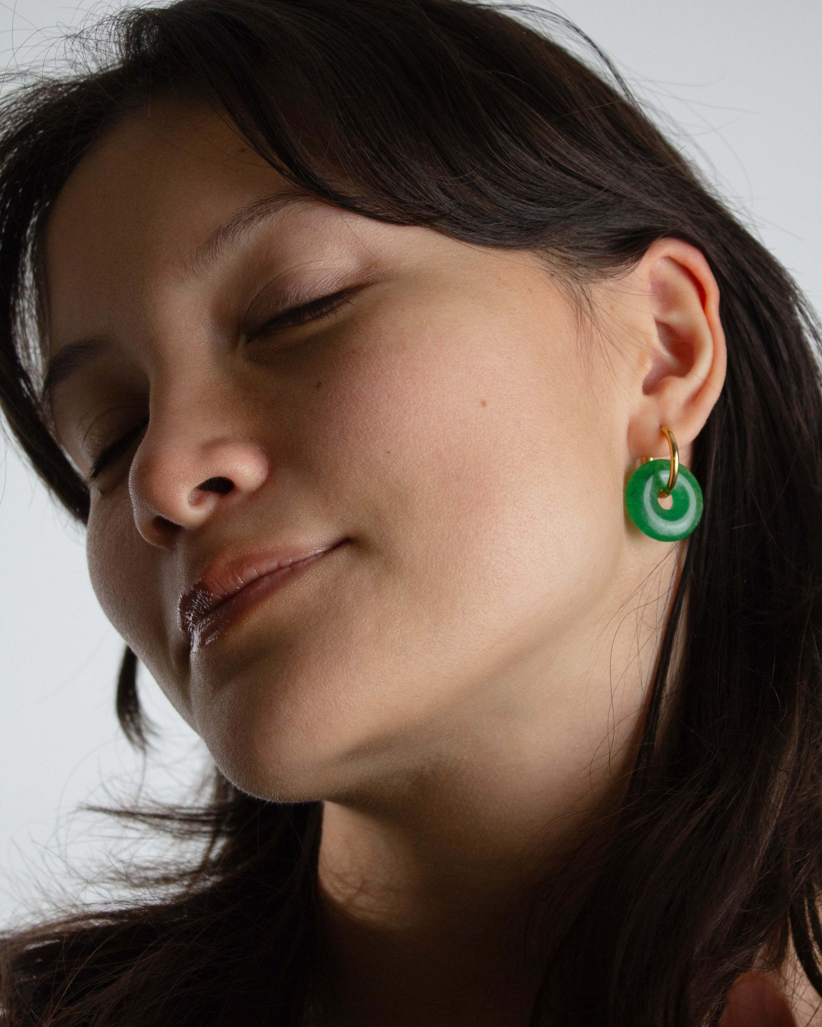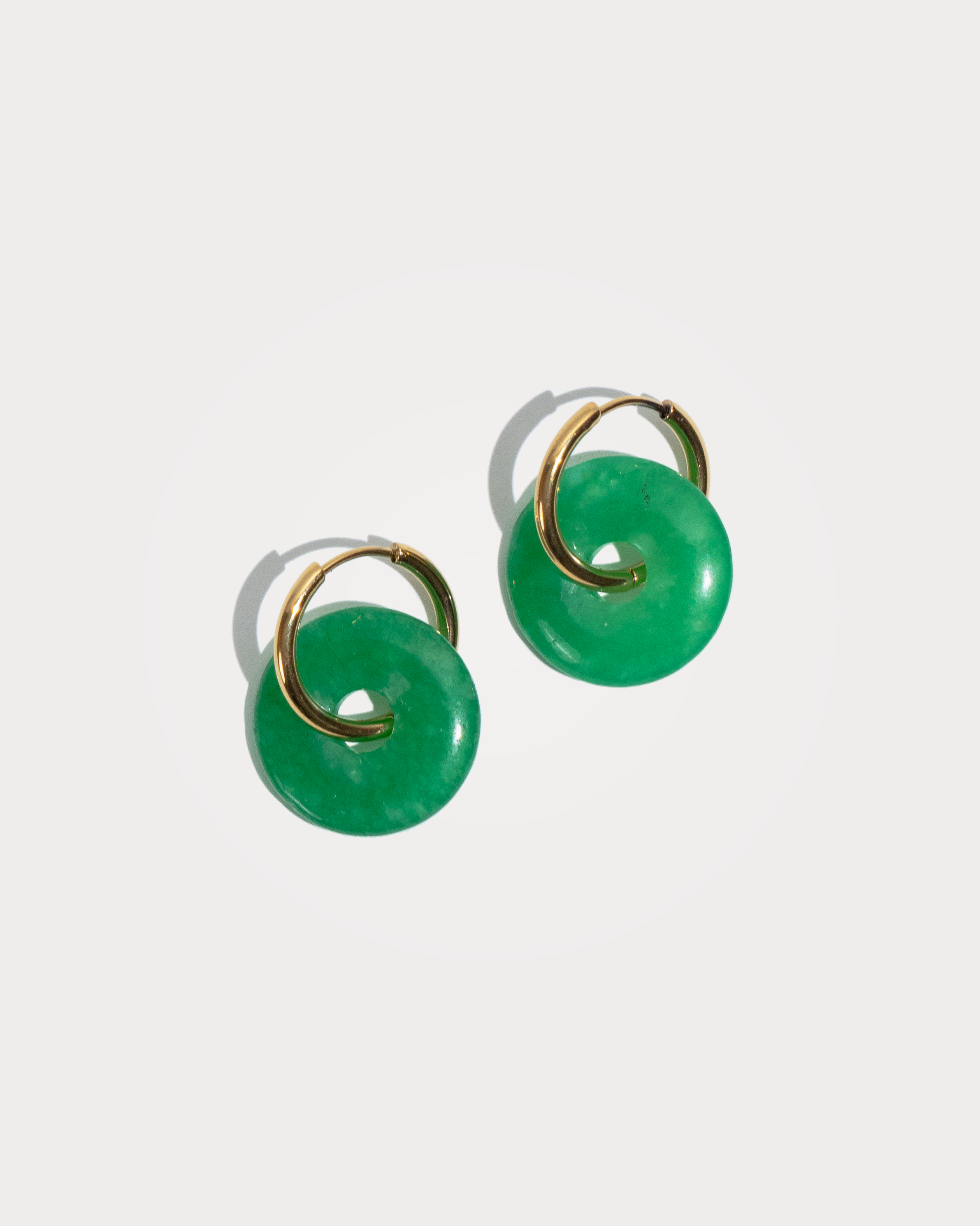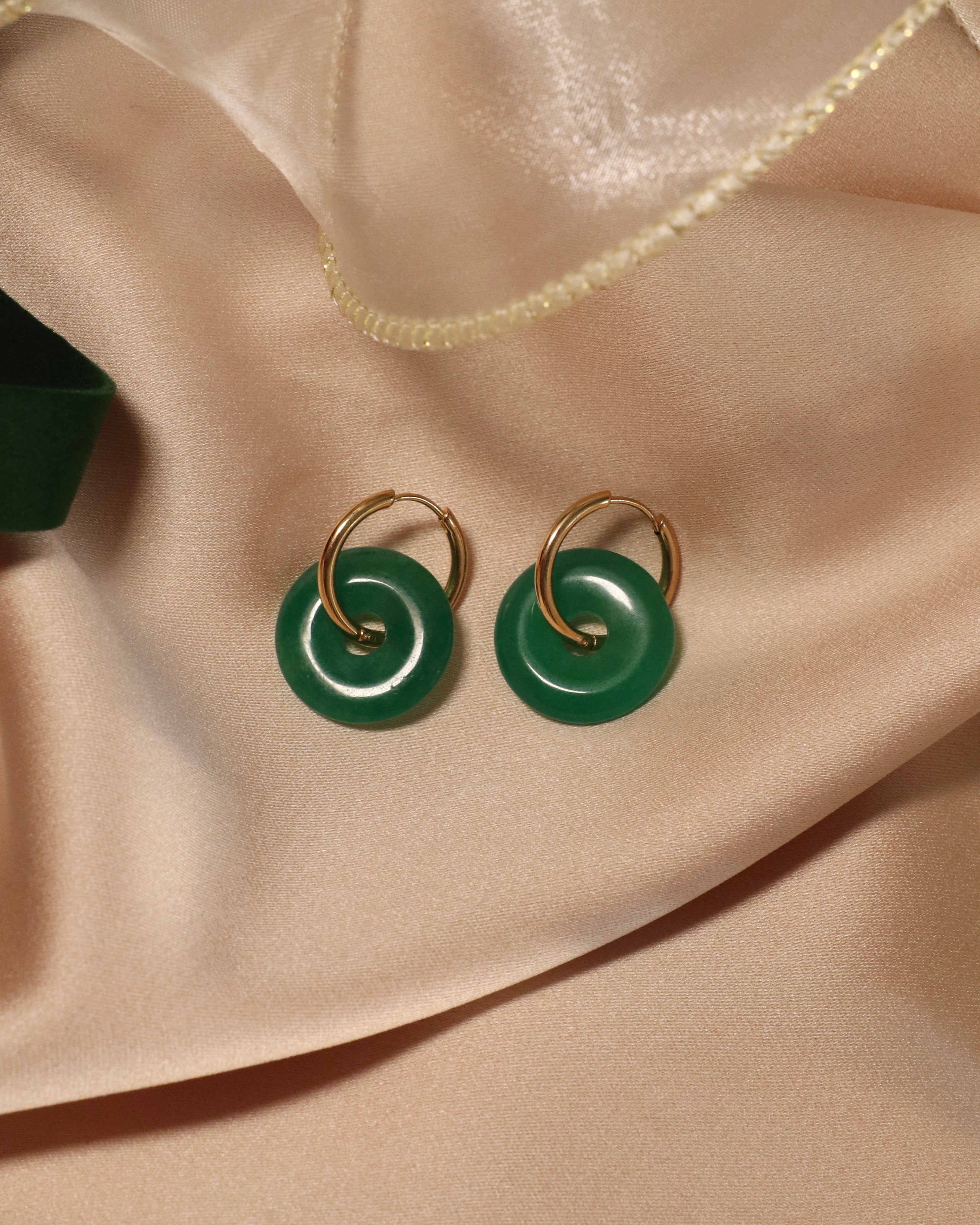 SOVANA, orecchini realizzati interamente a mano in acciaio chirurgico, disponibili sia nella versione in argento che nella versione placcata in oro 18k. Sono composti ognuno da un ciondolo tondo e piatto di Giada Malaysia verde scuro naturale a forma di ciambella