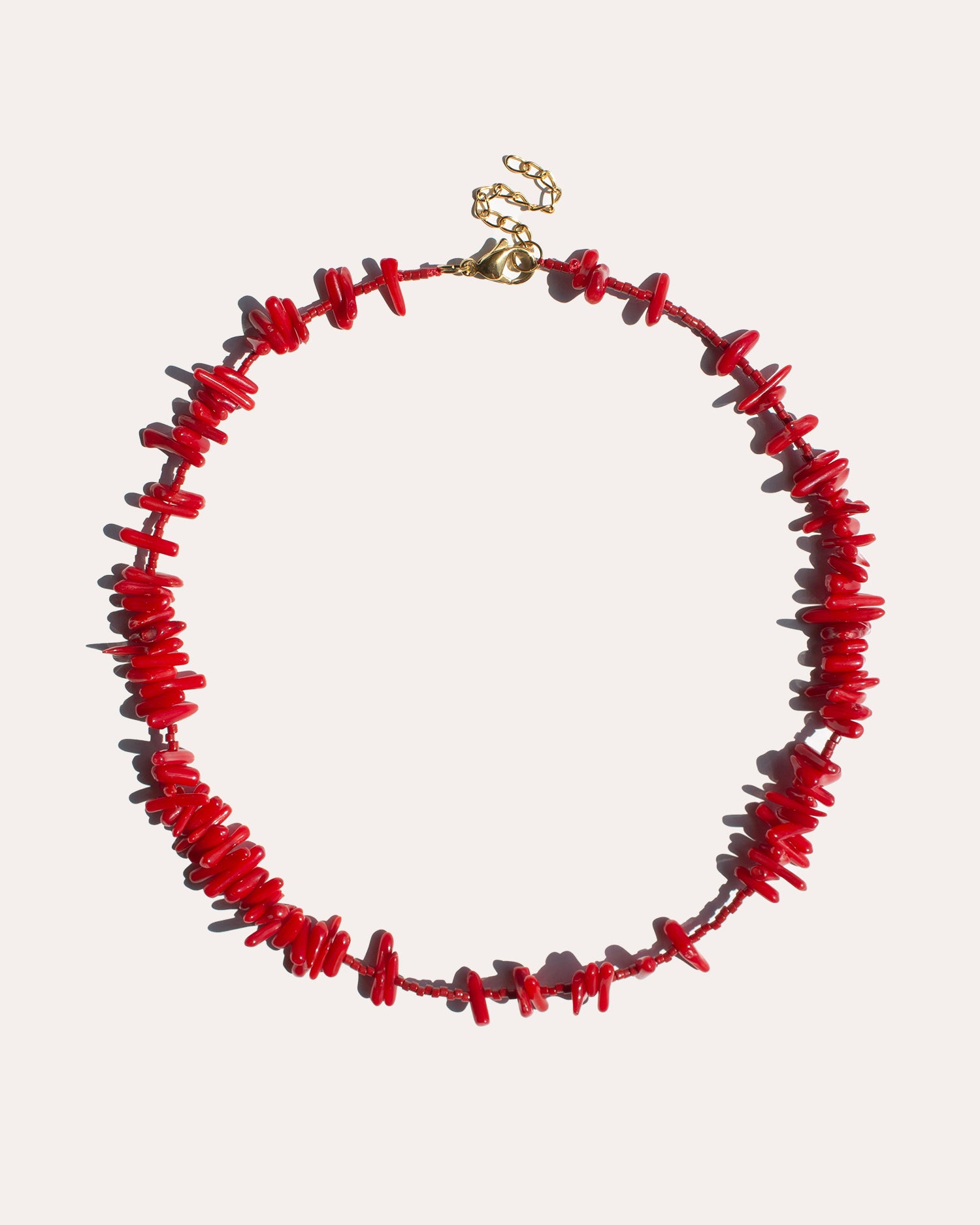 AITANA, collana realizzata interamente a mano in acciaio chirurgico, disponibile sia nella versione in argento che nella versione placcata in oro 18k. È composta da corallo di bambù naturale rosso e perline di vetro rosse.