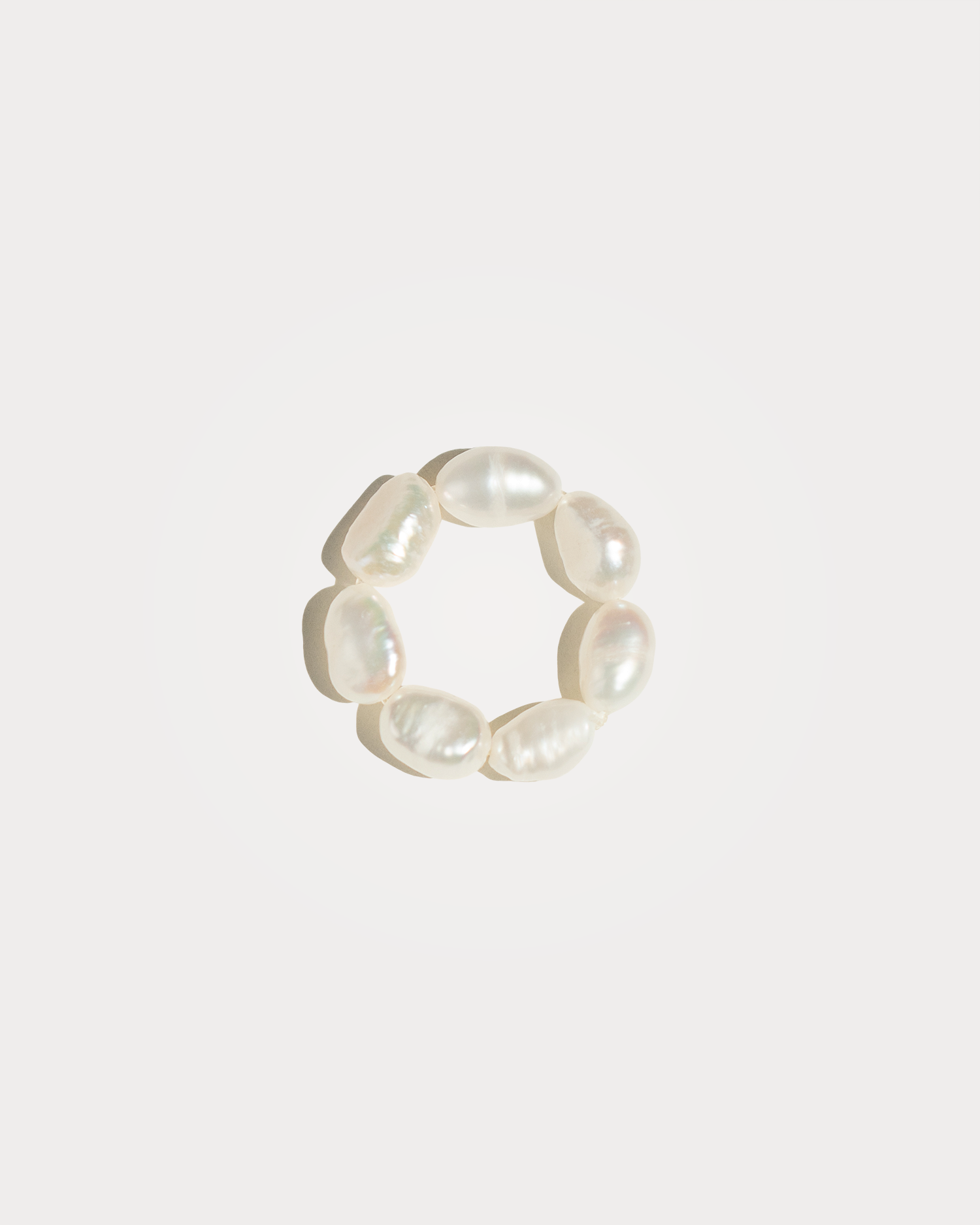 Liv, handmade ring in stainless steel, available both in the 18k gold-plated version and in the silver version. It is made of an elastic thread that allows it to adapt perfectly to any hand and is available in five different sizes. You can also choose between three different variations made up of white irregular natural freshwater pearls.