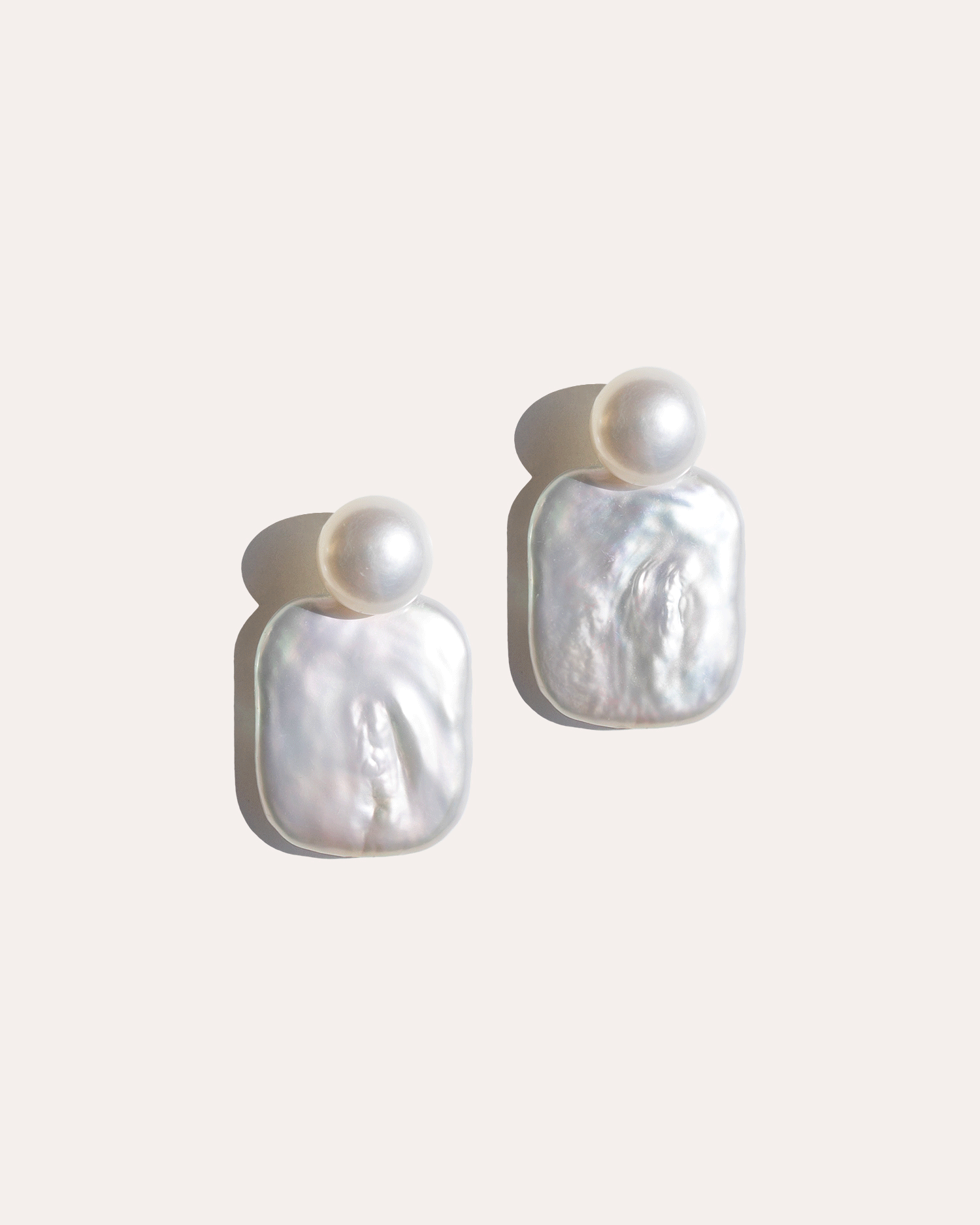 ELYSIA, orecchini 2-in-1 a lobo realizzati interamente a mano disponibili sia nella versione in argento che nella versione placcata in oro 24k. Sono composti ognuno da una perla di fiume naturale tonda e da un ciondolo removibile con una perla barocca rettangolare ed irregolare.