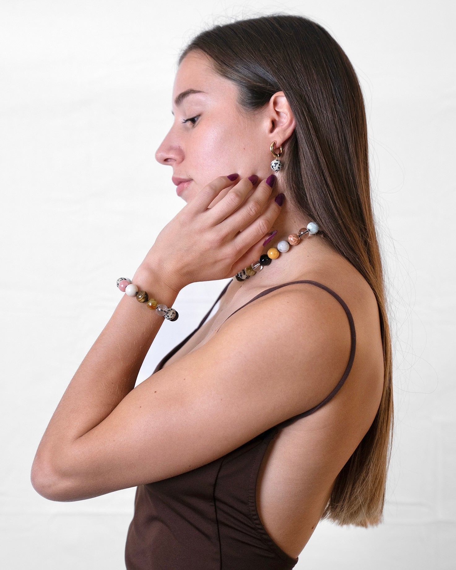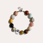 TERRENA, bracciale realizzato interamente a mano in acciaio chirurgico, disponibile sia nella versione in argento che nella versione placcata in oro 18k. È composto da una serie di pietre naturali ispirate ai colori della Terra tra cui: Mokaite, Cristallo di Rocca, Occhio di Tigre, Giada, Larimar, Onice e diverse varianti di Diaspro.